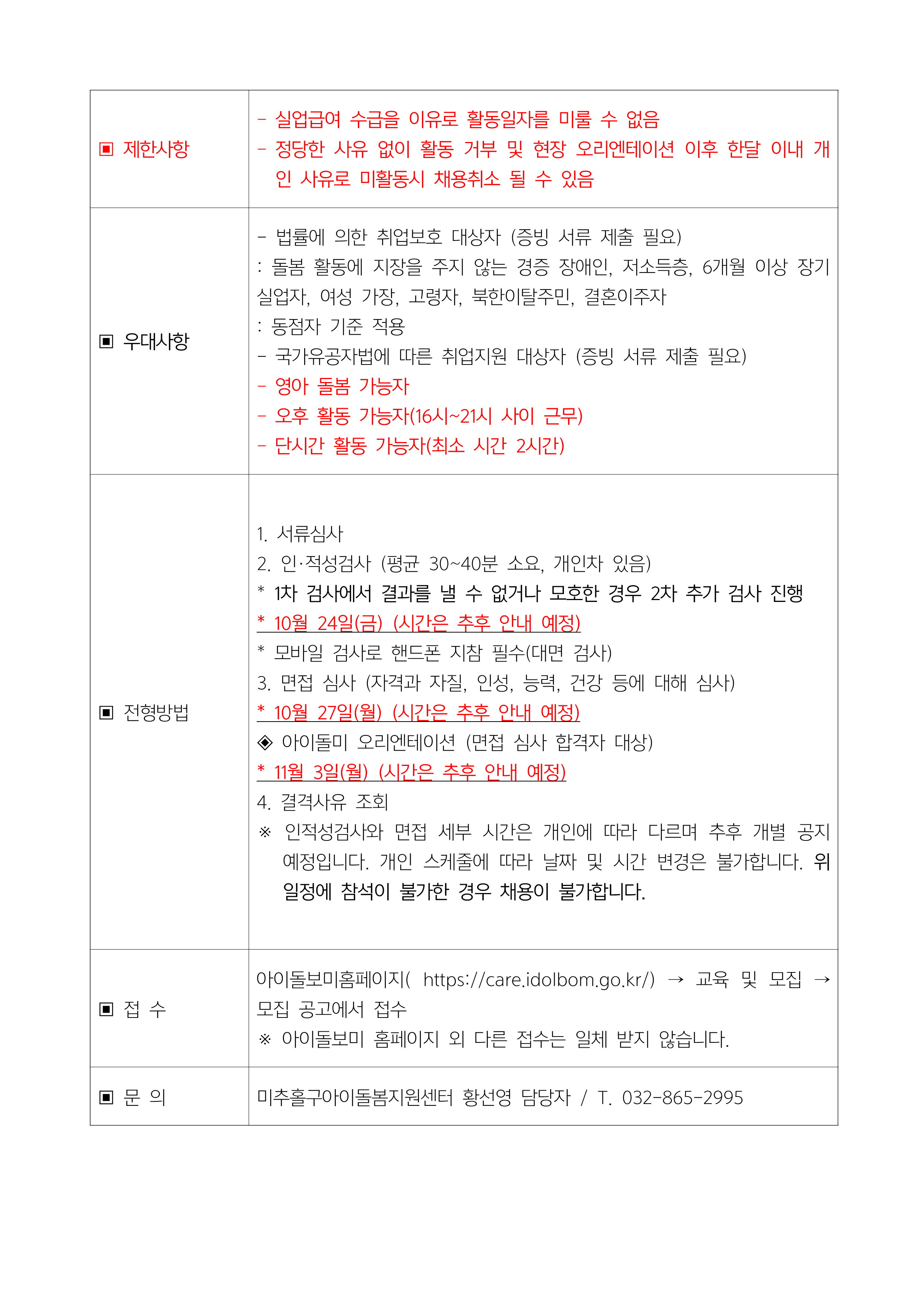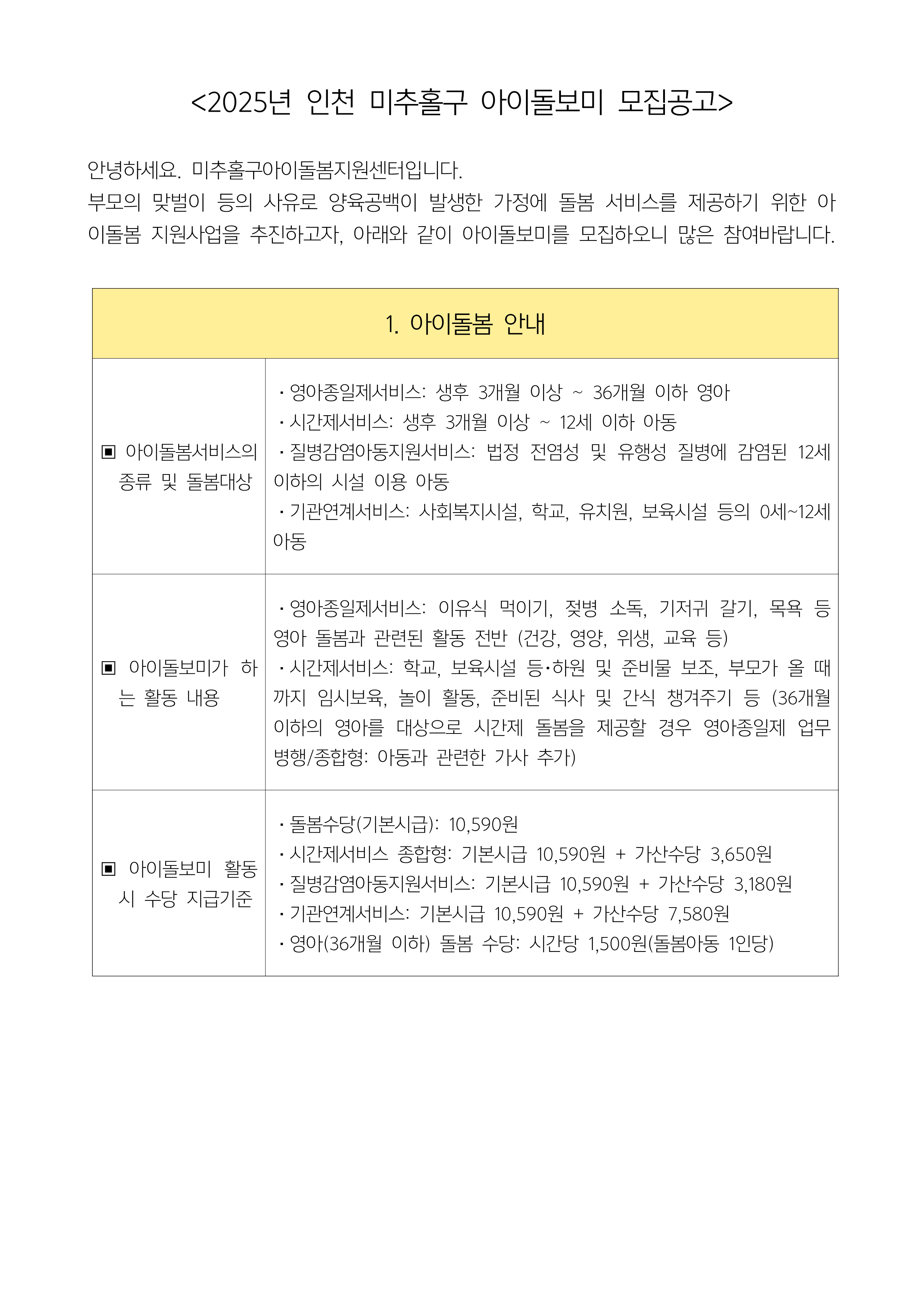 2025년 인천 미추홀구 아이돌보미 모집공고(2025. 10. 2. ~ 10. 22.)