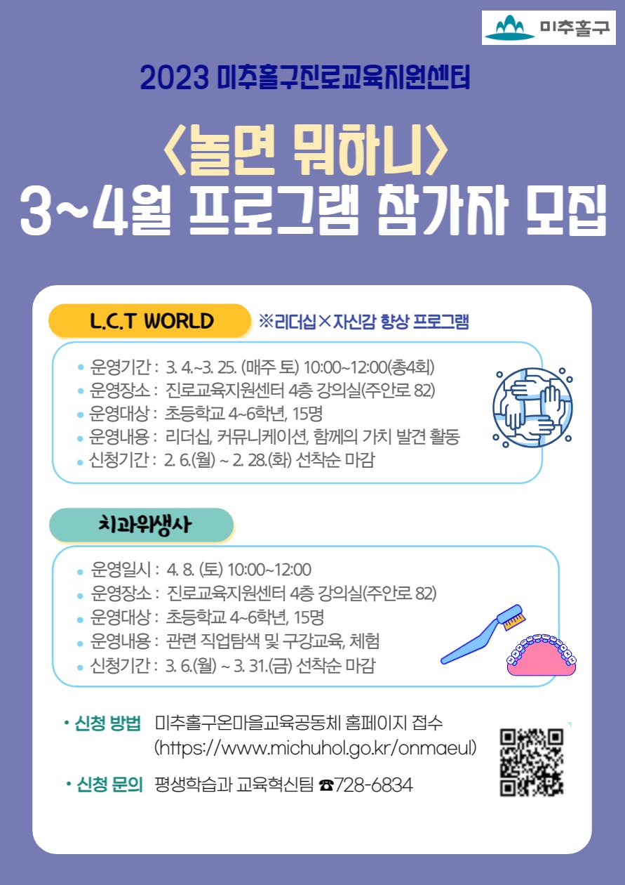 미추홀구진로교육지원센터엣어 <놀면 뭐하니> 3~4월 프로그램 참가자를 모집합니다.