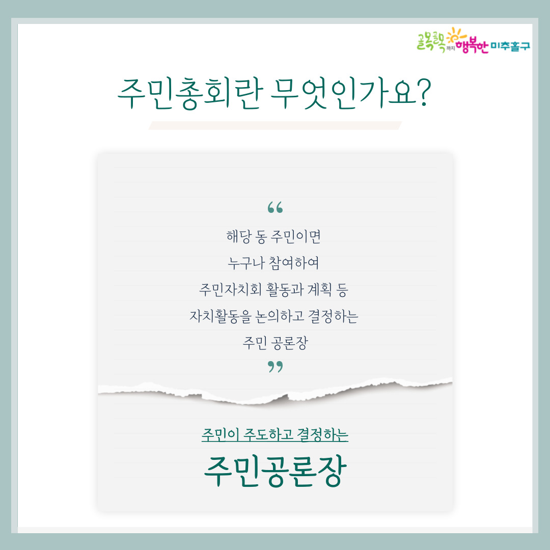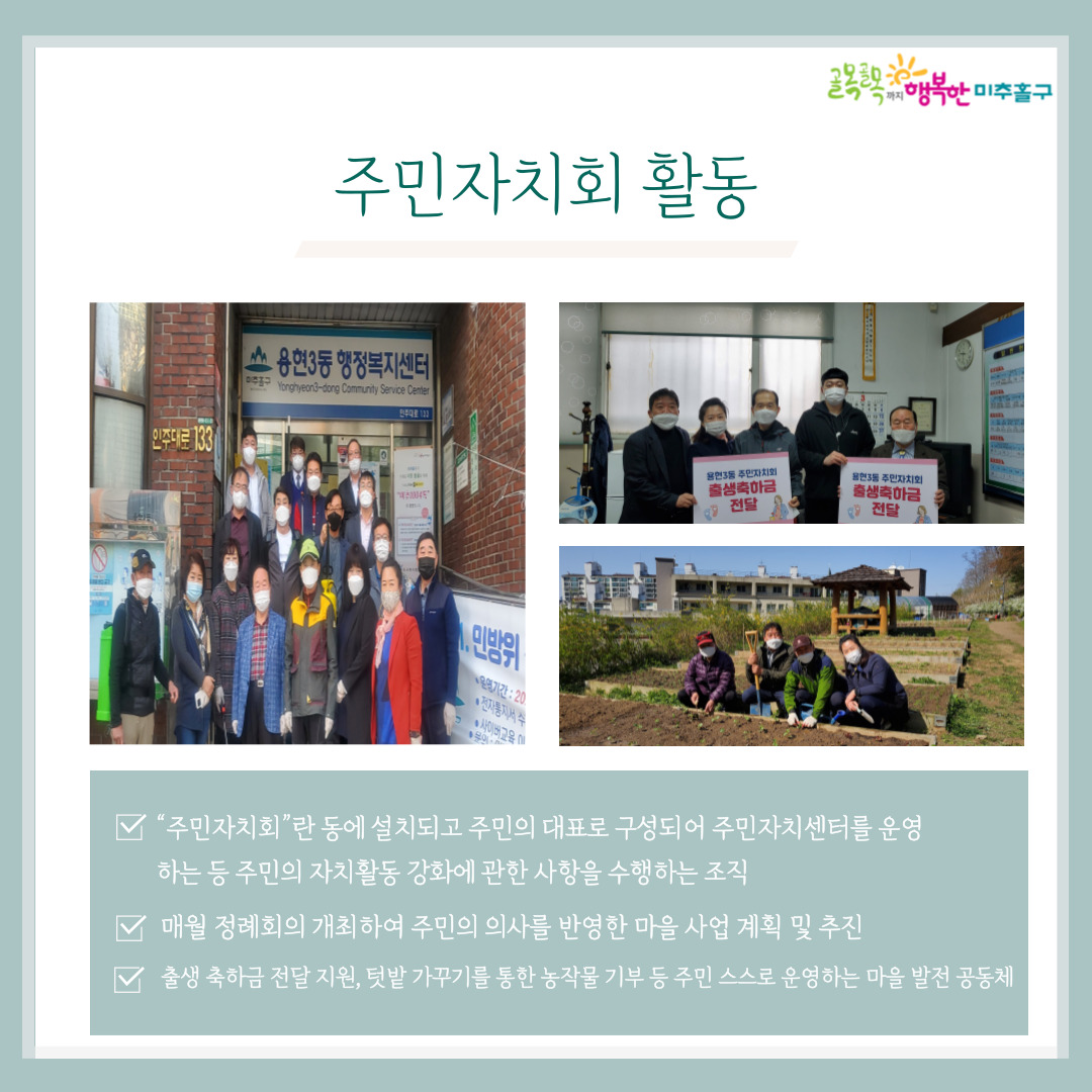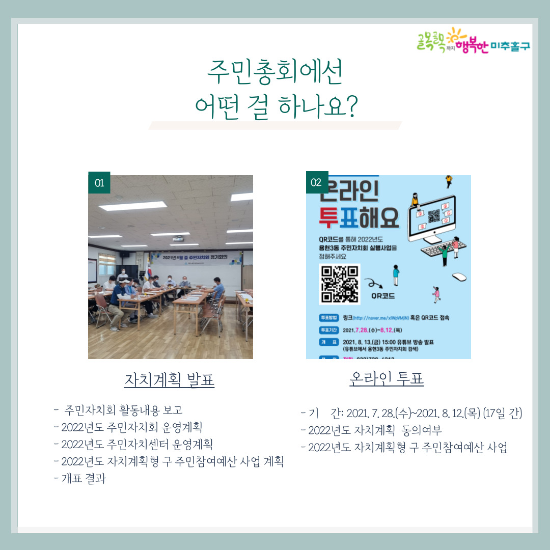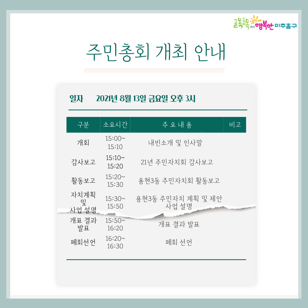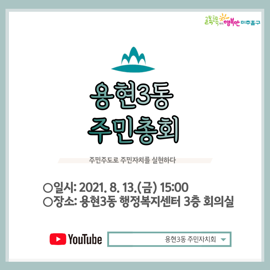 『인천광역시 미추홀구 주민자치회 및 주민자치센터 설치·운영에 관한 조례』 제19조와 『용현3동 주민자치회 운영세칙』 제14조에 따라 아래와 같이 주민총회 개최를 알립니다. 코로나19 지역 확산을 방지하고자 비대면(온라인 투표 및 유투브 라이브방송)으로 총회를 개최함을 알려드립니다.