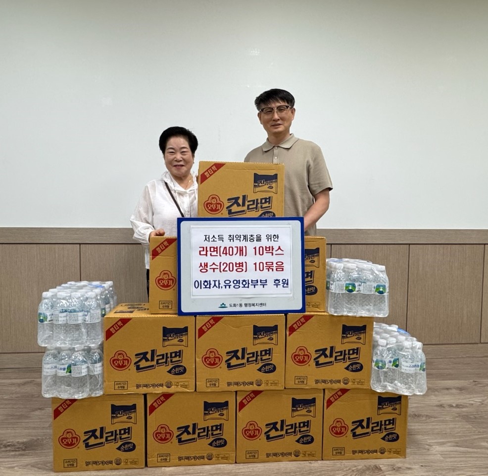 25.7.28.(월) 도화1동 개인기부자(이화자,유영화부부)가 저소득 취약계층을 위해 라면(400개)과 생수(200병)를 후원했습니다.