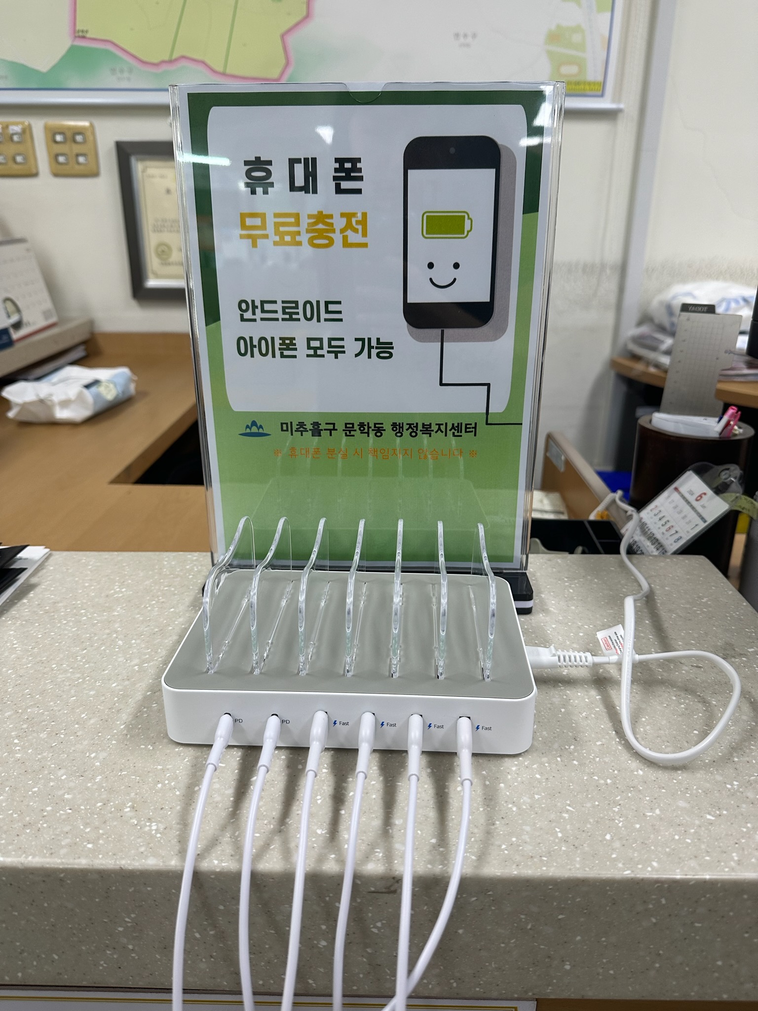 동 행정복지센터 방문 민원인을 위한 휴대폰 충전기 (최대6대 동시충전가능) 비치