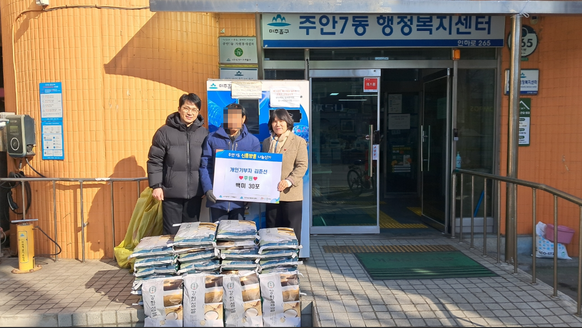 ○ 후 원 자 : 개인기부자 김0선 ○ 후원 일자 : 2026. 2. 9.(월) ○ 후원 품목 : 쌀(10kg) 30포○ 후원 대상 : 주안7동 저소득 취약계층