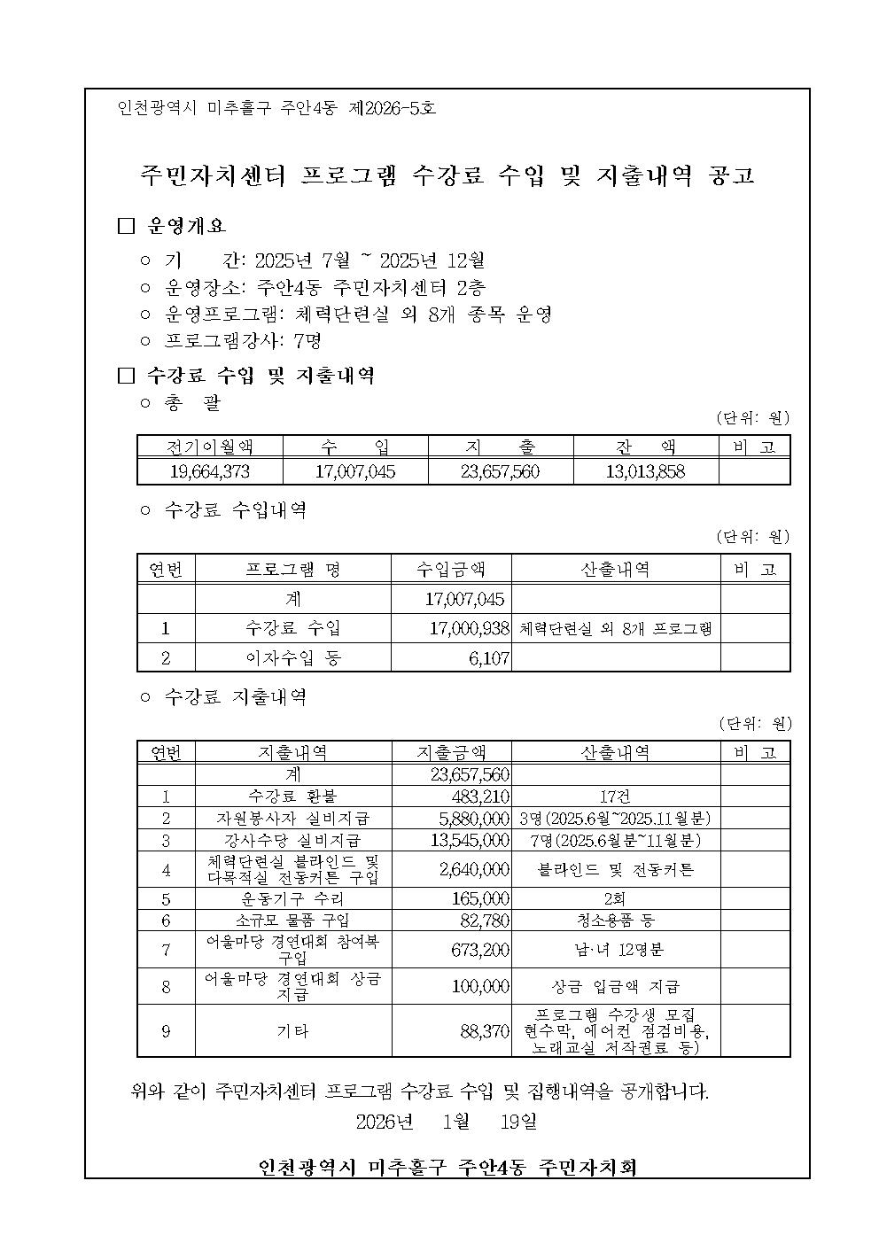 2025년 하반기 주안4동 주민자치센터 프로그램 수강료 수입 및 지출내역 공고