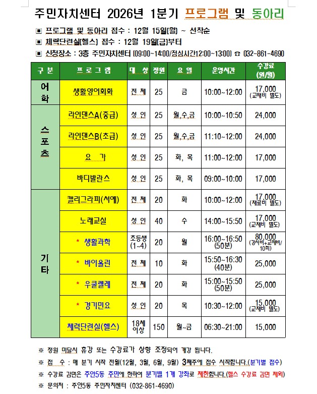 2026년 1분기 주민자치센터 프로그램 및 동아리 접수 안내