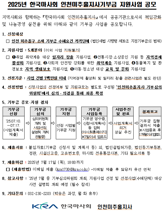 2025년 2차 한국마사회 인천미추홀지사 기부금 지원 사업 공모 안내