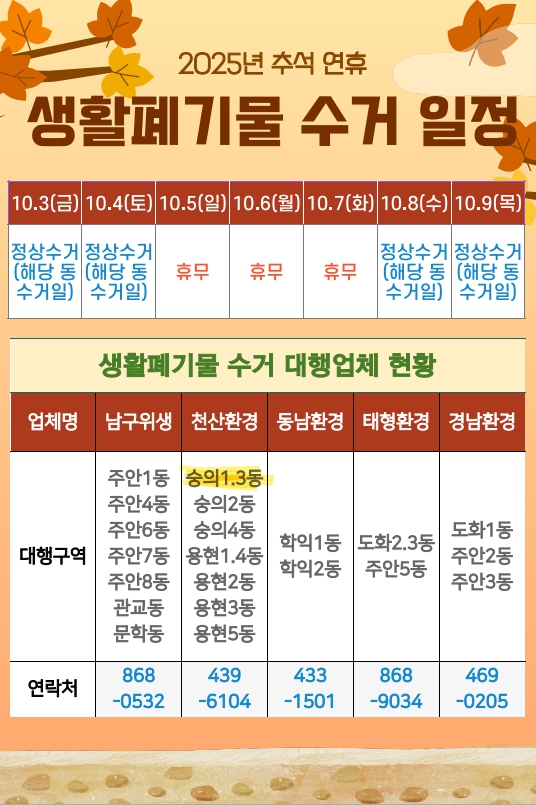 ※ 숭의1.3동 자원순환(청소) 업무 관련 문의는 ☎032-728-6105 로 연락 바랍니다.