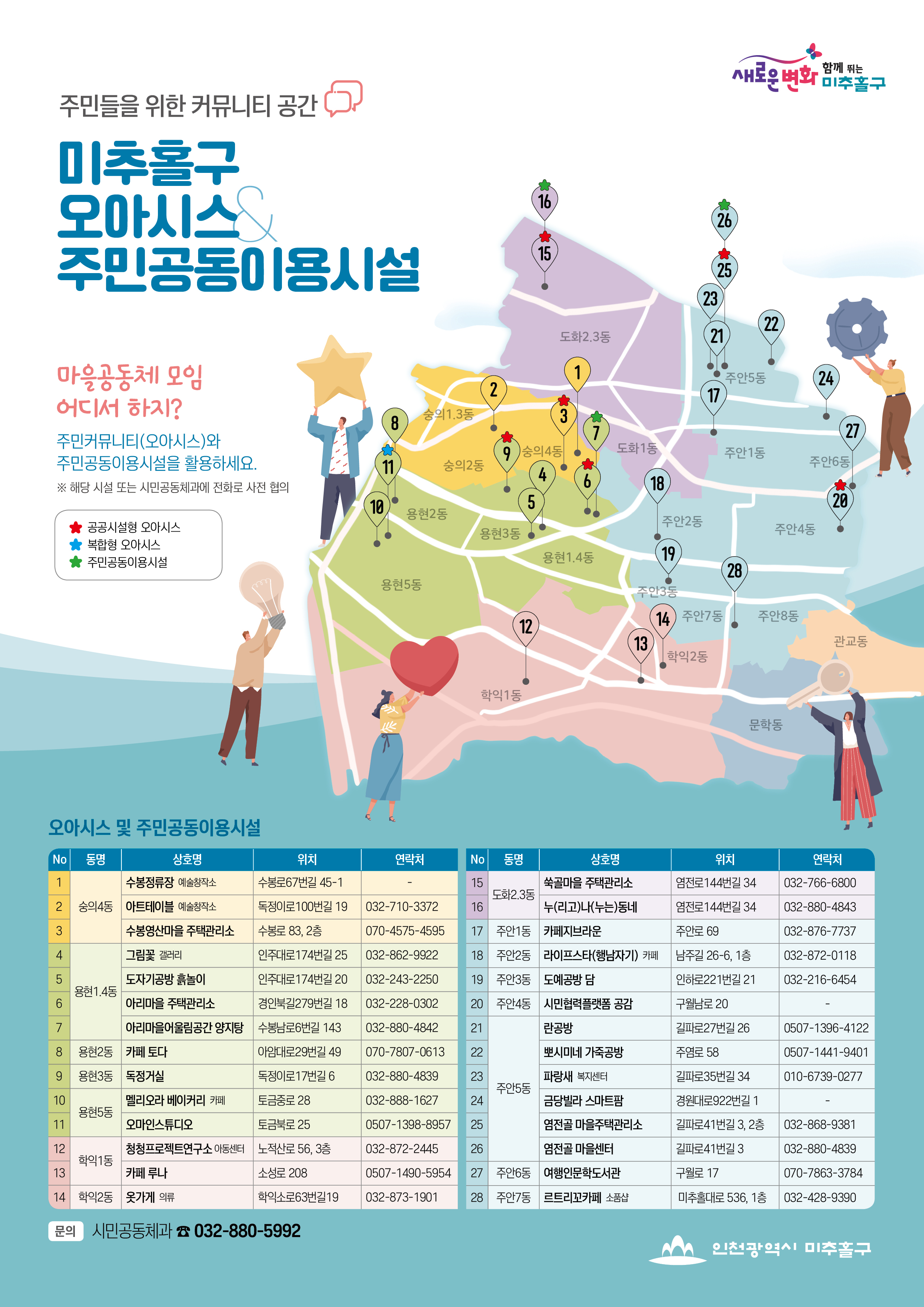 미추홀구에서 주민 간 유기적 만남을 촉진하고 마을공동체 활동 및 지역경제 활성화를 위해 오아시스 및 주민공동이용시설을