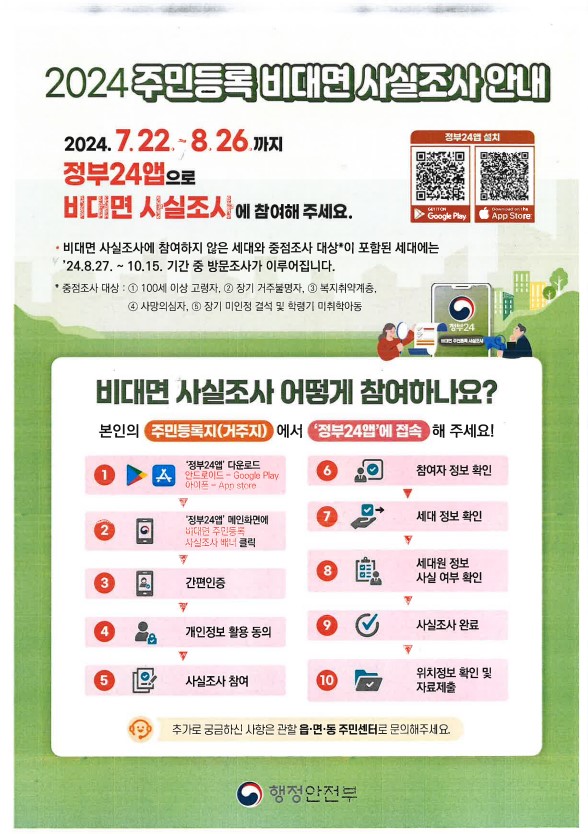 2024.7.22~8.26. 까지 정부 24앱으로 비대면 사실조사에 참여해주세요.