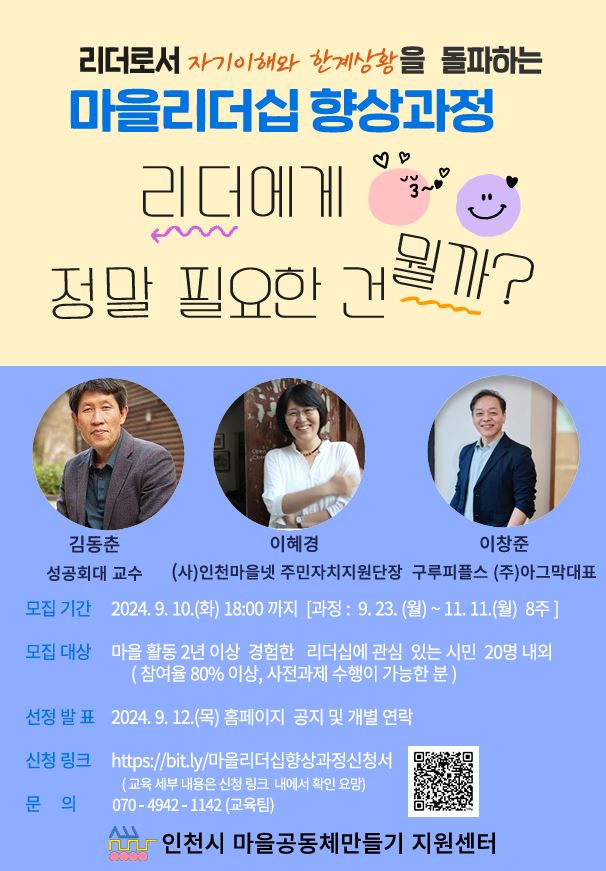 인천광역시 마을공동체만들기 지원센터에서 아래와 같이 "마을배움실천학교(마을리더십 향상과정)"를 추진하오니,