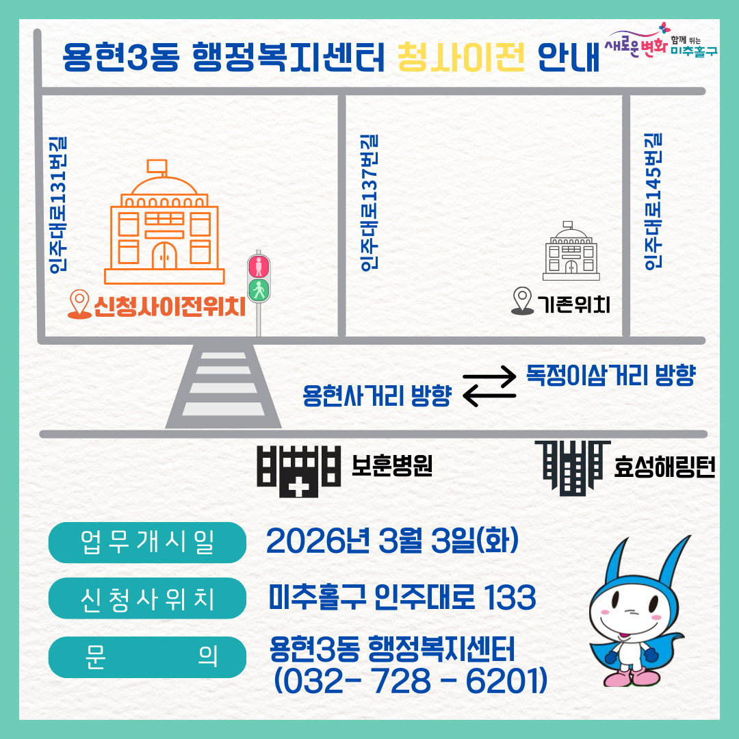 용현3동 행정복지센터 청사 신축에 따라 아래와 같이 청사 이전을 안내드리오니 참고하시기 바랍니다.