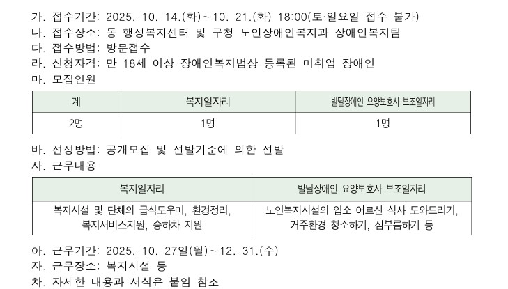 2025년 장애인일자리사업 참여자를 아래와 같이 추가모집합니다.