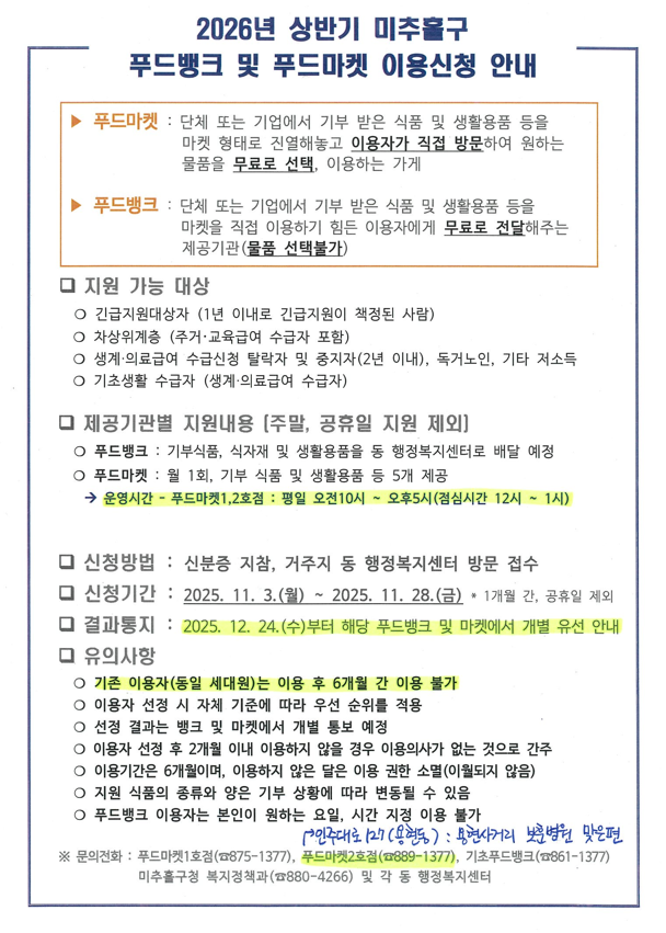 2026년 상반기 미추홀구 푸드뱅크 및 푸드마켓 이용신청 안내