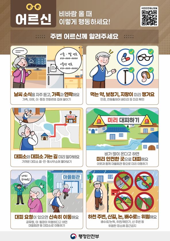 고령자의 생명과 안전을 보호하고자 행정안전부에서 고령자 맞춤형 국민행동요령을 제작하고 홍보하오니 많은 관심 부탁드립니다.