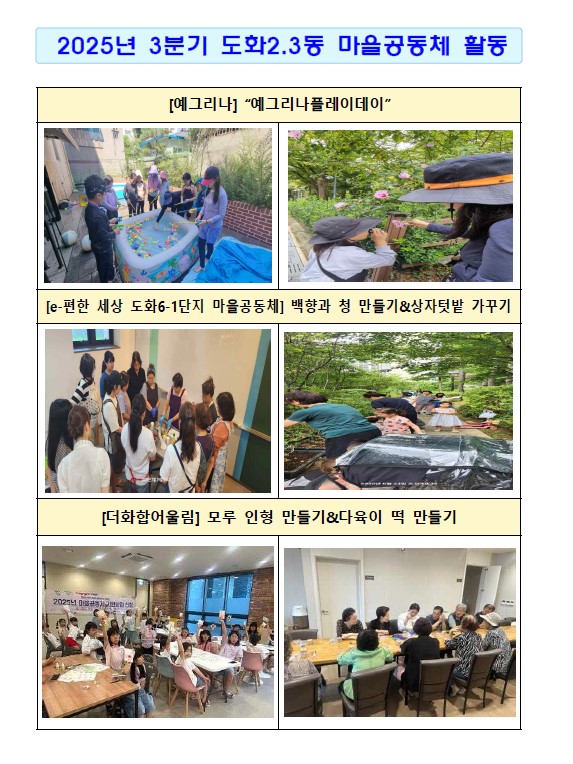 도화2.3동 3분기 마을공동체 활동을 붙임과 같이 안내합니다.
