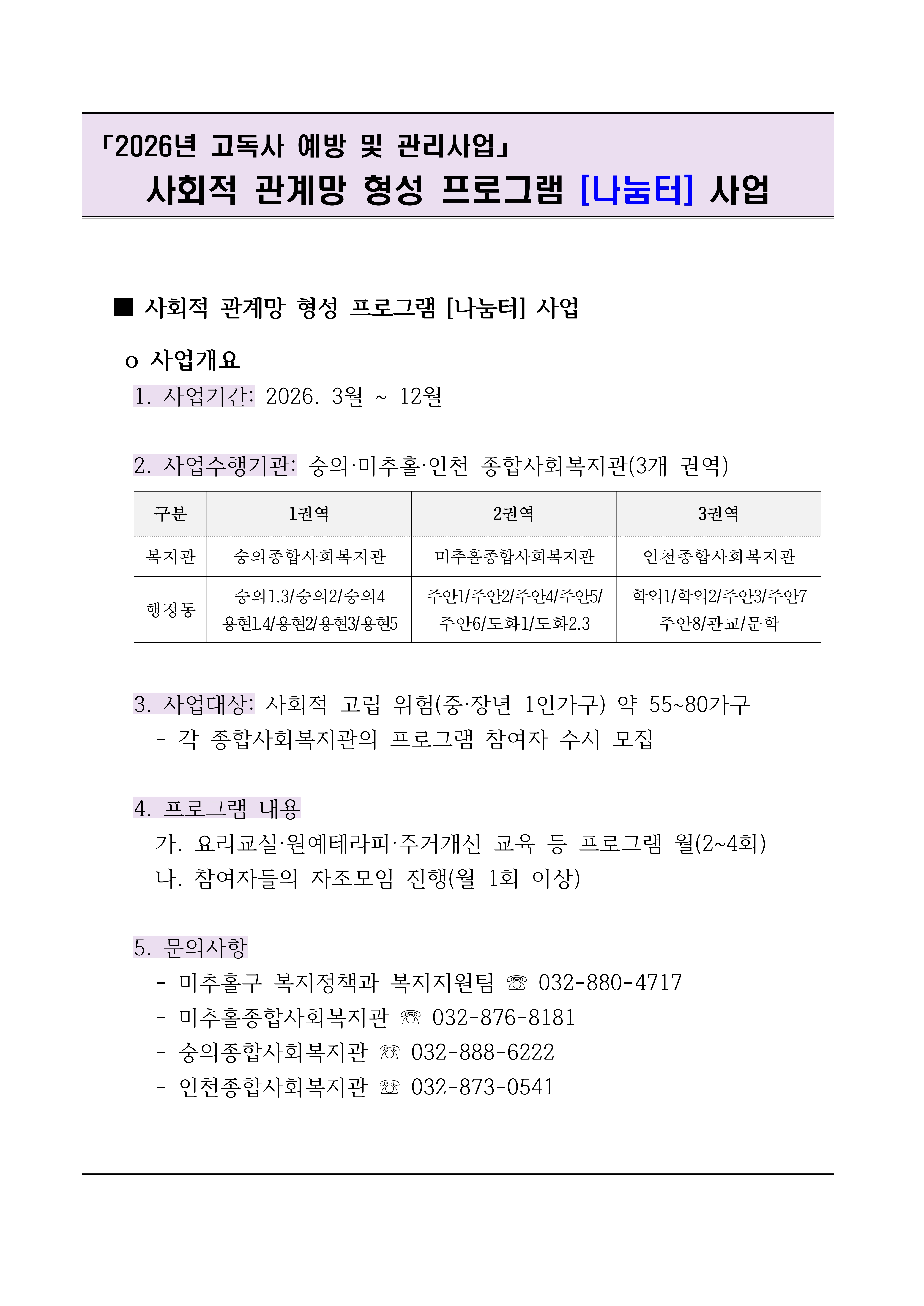 2026 고독사 예방 및 관리사업 중 하나인 사회적 관계망 형성 프로그램 「나눔터」사업 안내입니다. 관심 있으신 분들은 미추홀종합사회복지관 032-876-8181으로 연락하시기 바랍니다.