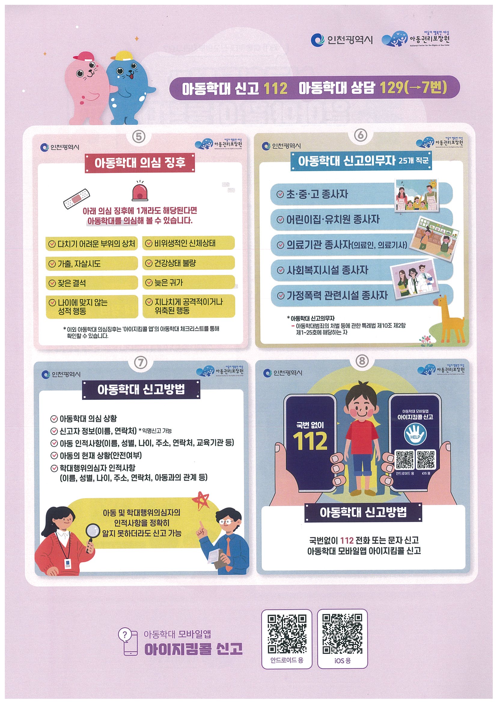 아동학대 신고 ☎112, 아동학대 상담 ☎129(->6번)