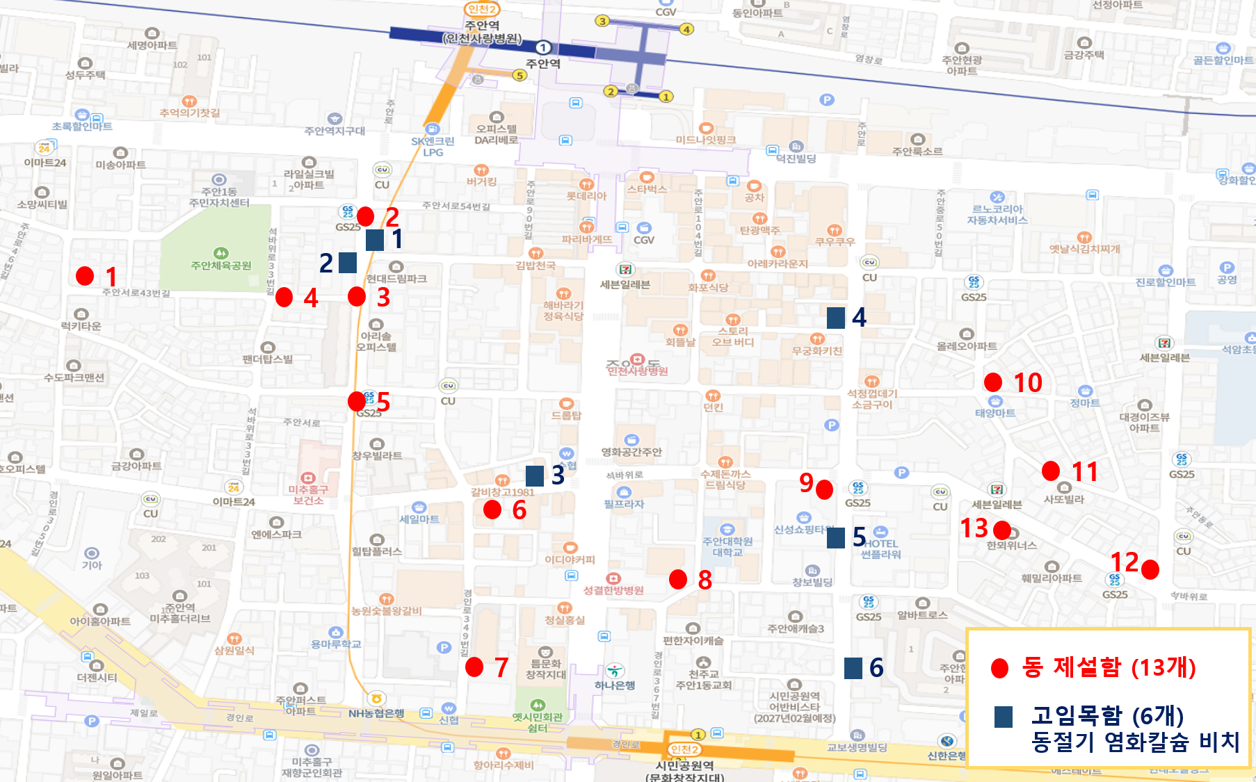관내 설치된 제설함 및 고임목함 위치도입니다.
