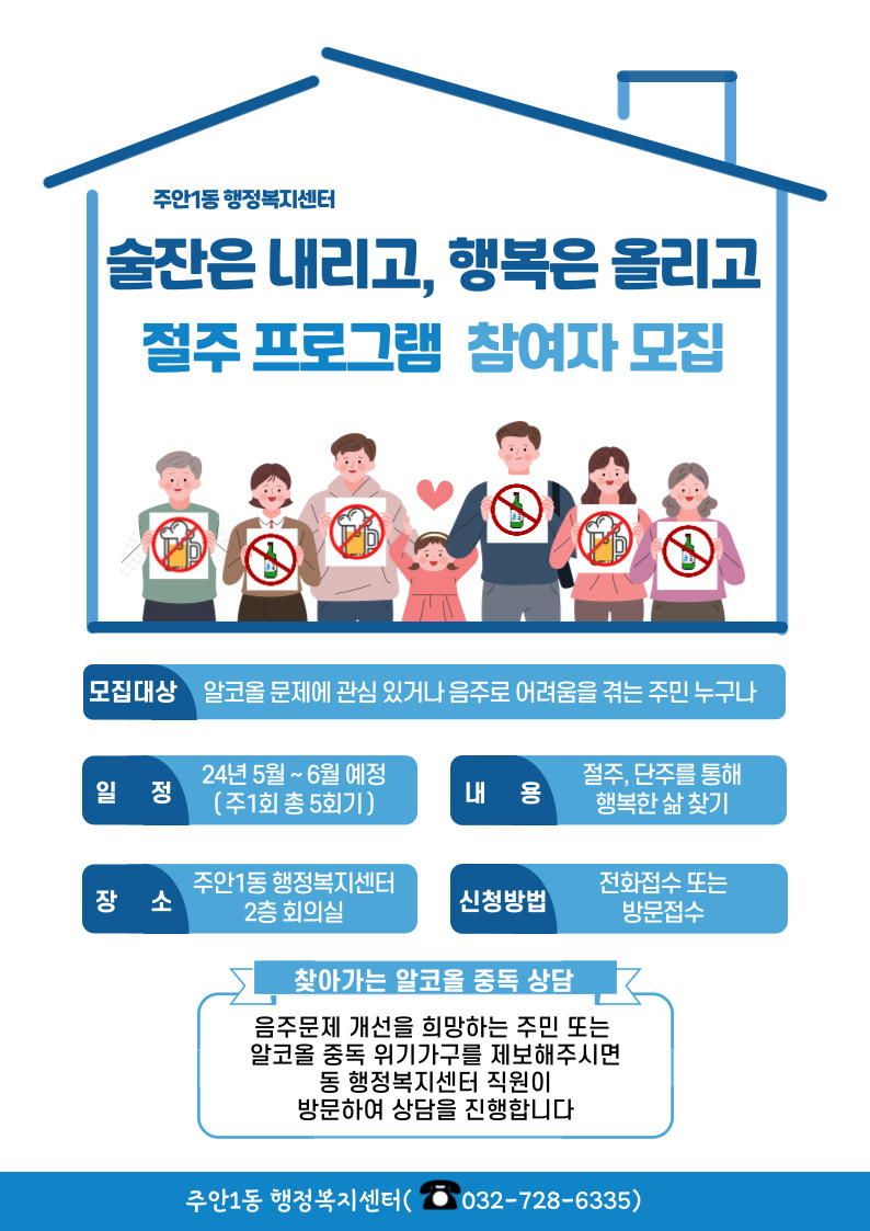 2024년 「술잔은 내리고, 행복은 올리고」 관내 절주프로그램을 시행하오니 많은 참여 부탁드립니다.