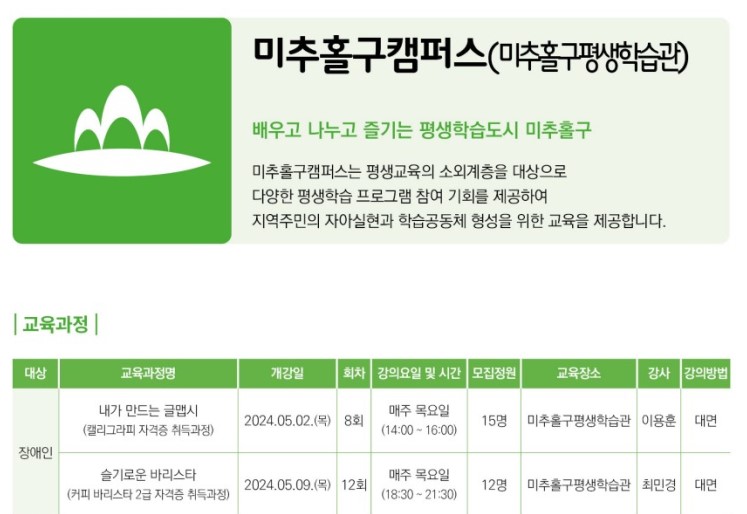 - 문의처: 미추홀구 평생학습관 032)728-6545