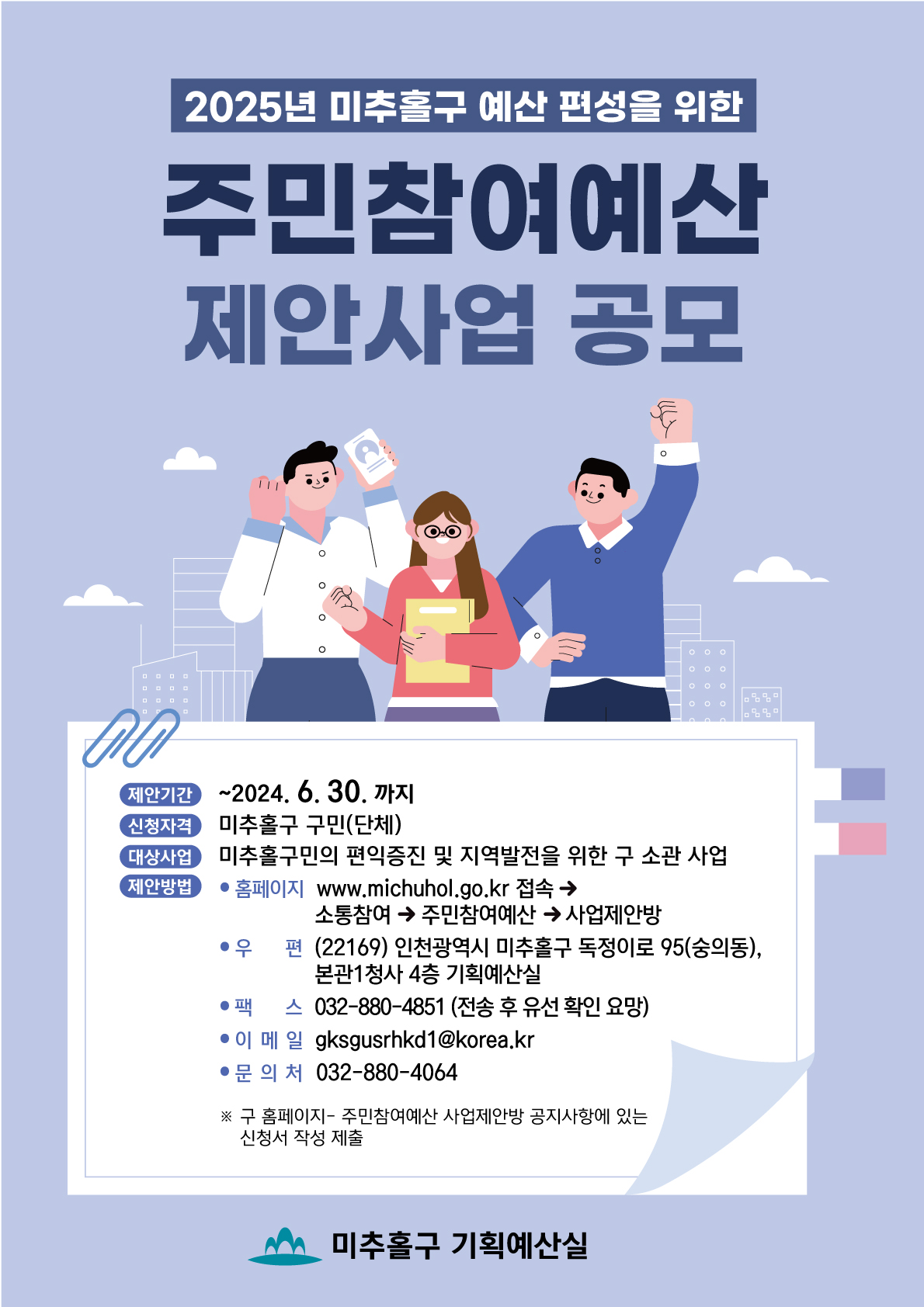 2025년도 미추홀구 예산편성을 위한 주민참여예산 제안사업 공모에 많은 참여 바랍니다.