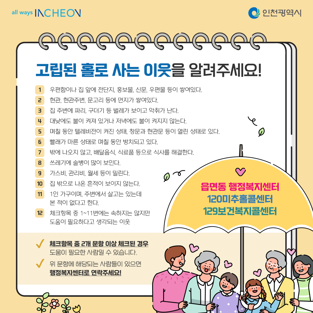 미추홀구의 고독사 예방을 위해 위험자를 상시 발굴하고 있으니, 고립된 이웃을 알고 있는 주민여러분의 많은 연락을 바랍니다.