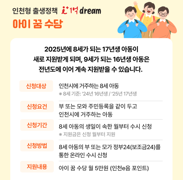아이 꿈 수당 관련 문의안내: 주안1동 행정복지센터 아동담당자(032-728-6332)