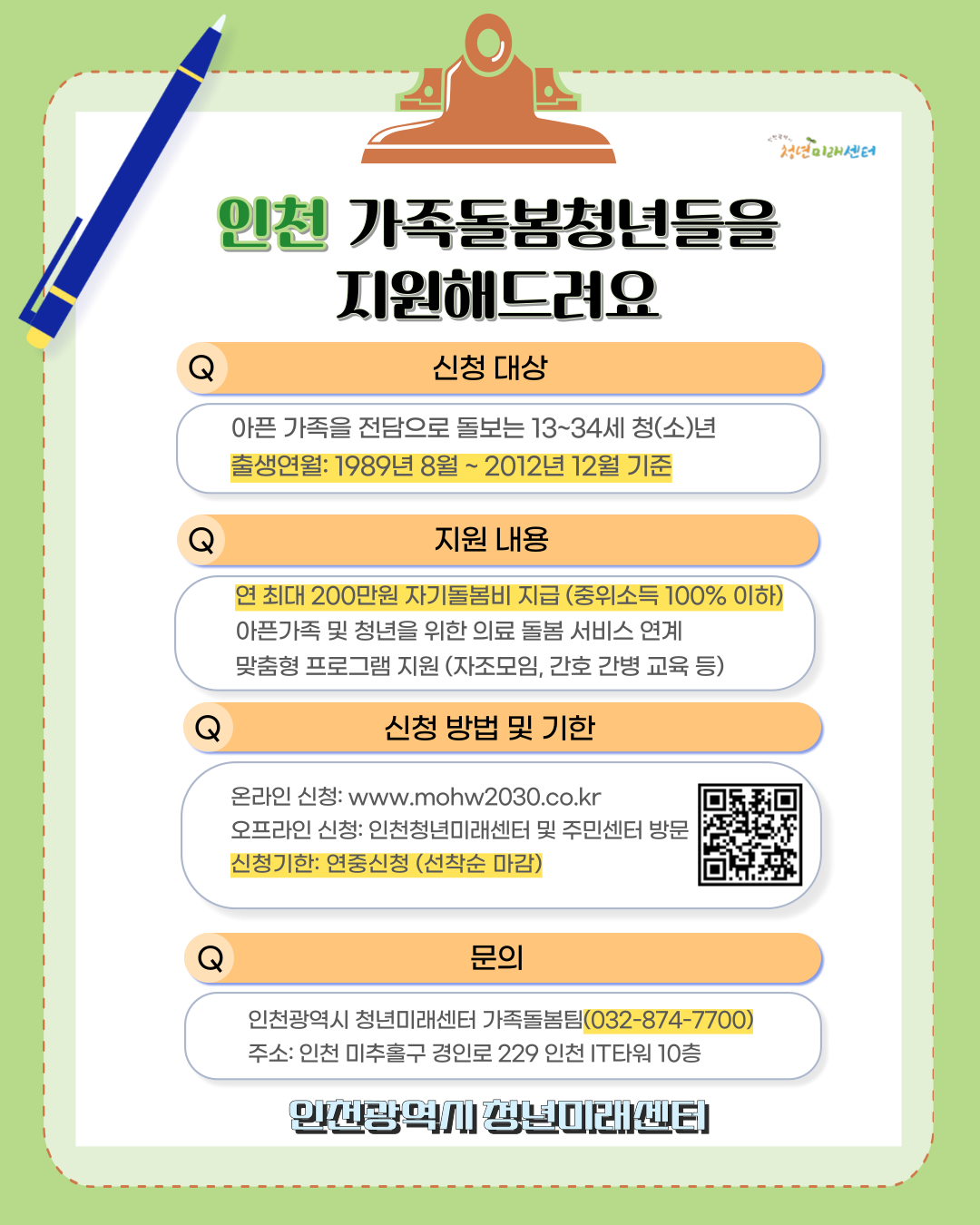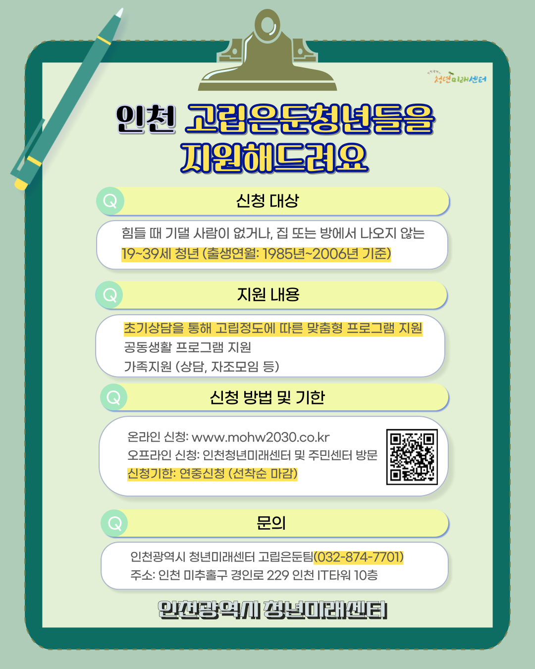 고립은둔 청년 및 가족돌봄 청년 지원사업 안내(인천광역시청년미래센터)