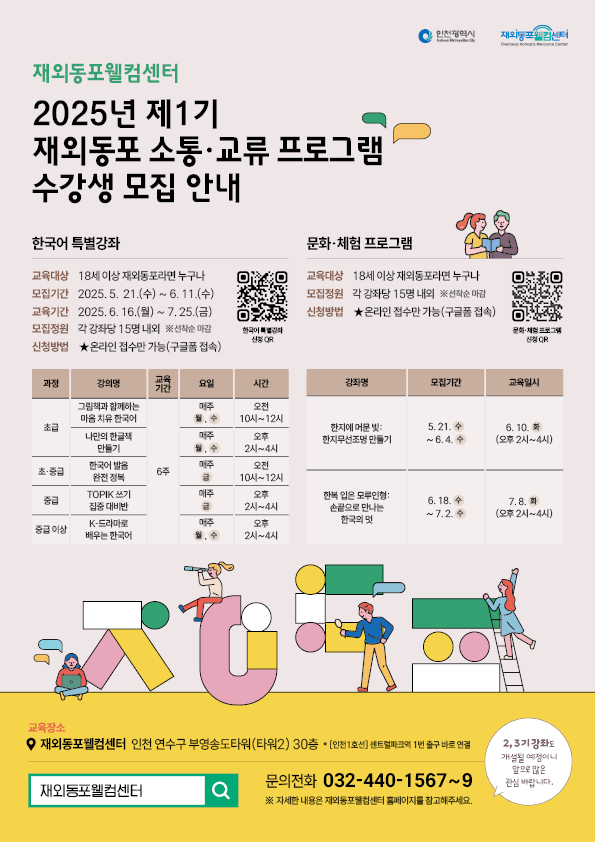 국내·외 재외동포를 위해 운영중인 「재외동포웰컴센터」에서 재외동포와의 소통 및 교류 기회 확대를 위하여 아래와 같이 프로그램 수강생을 모집하오니 많은 관심 바랍니다.