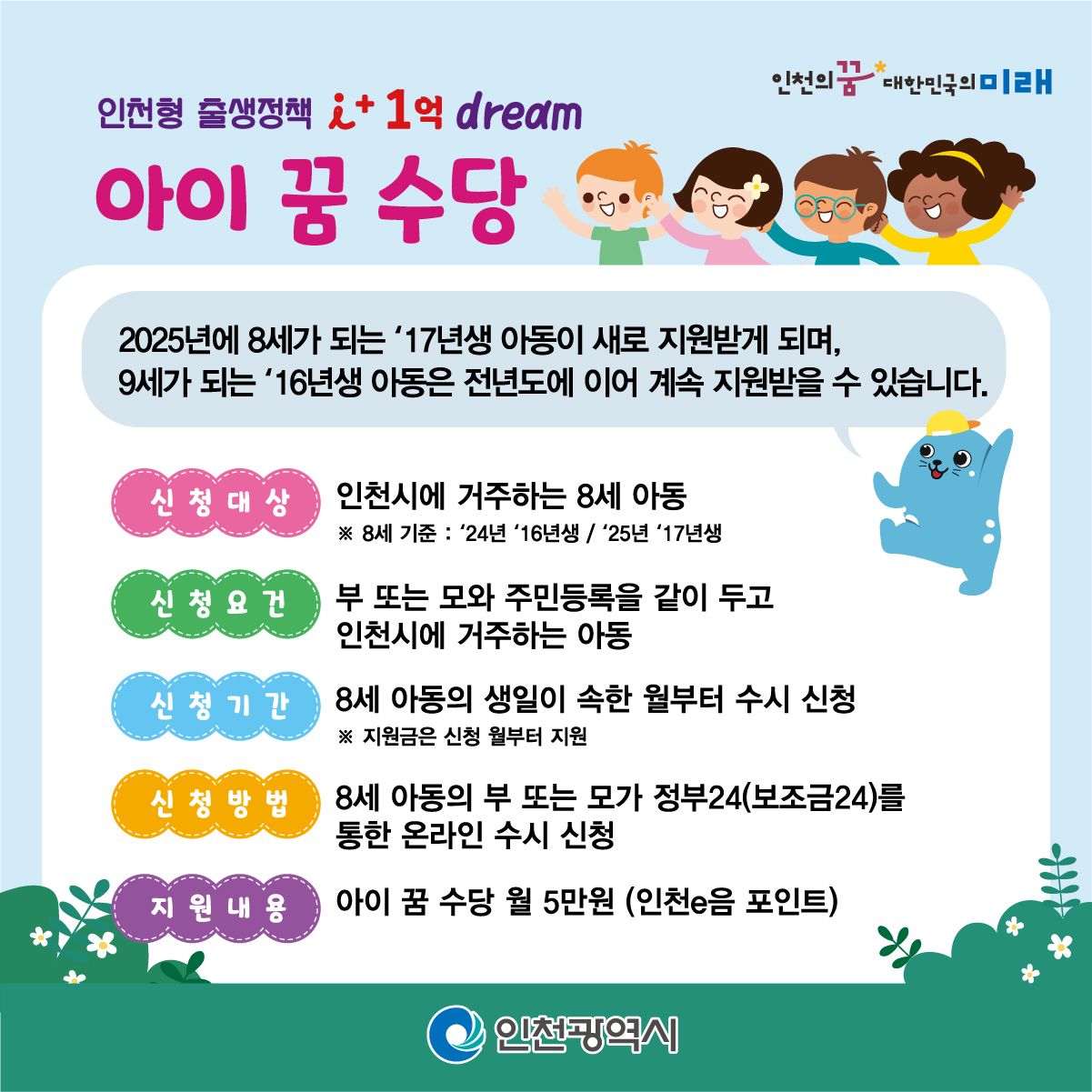 ○ 신청요건: 부 또는 모와 인천시에 주민등록을 같이 두고 거주하는 한국 국적 아동