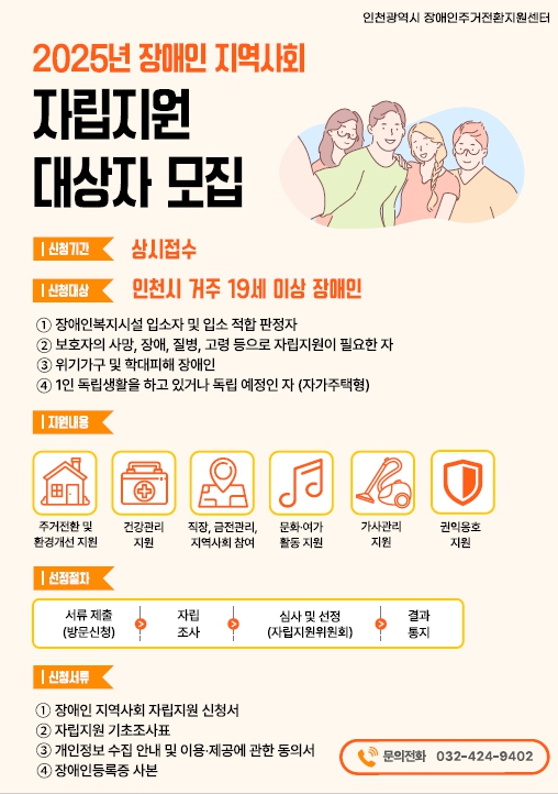 인천시에서는 보건복지부에서 추진하고 있는 '장애인 지역사회 자립지원 시범사업'에 공모 선정됭 2022년부터 장애인의 지역사회 정착 및 자립생활을 지원하고 있습니다.