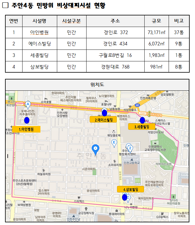 주안4동 민방위 대피시설 현황(2025.12.12.기준)을 아래와 같이 안내드리오니, 참고하여 주시기 바랍니다.