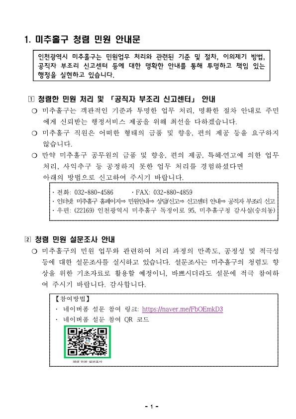 미추홀구 청렴 민원 안내문