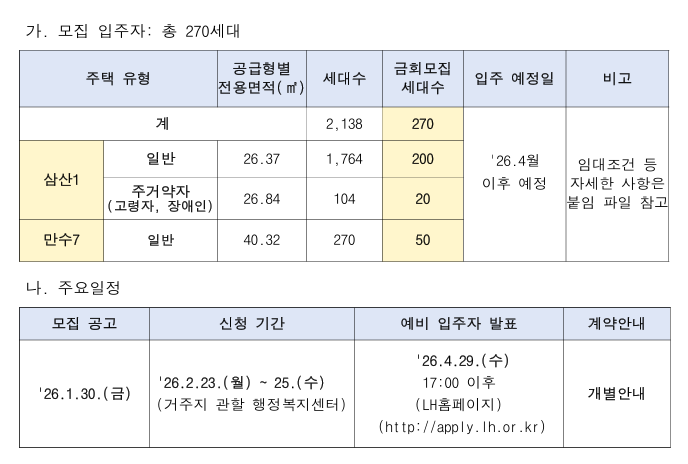 LH영구임대주택(삼산1단지, 만수7단지) 예비입주자 모집 안내