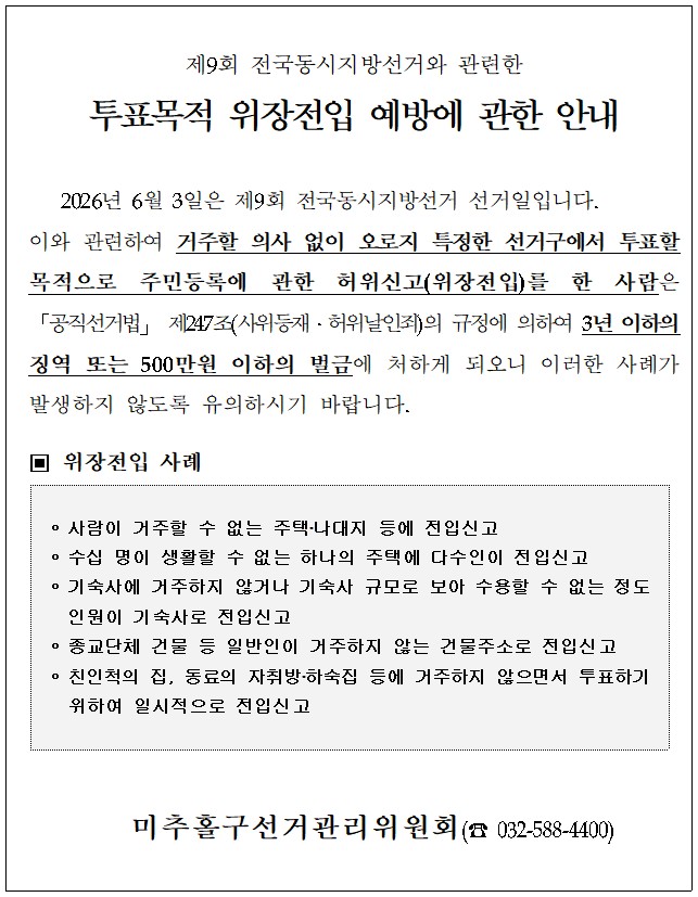 투표목적 위장전입 예방 안내