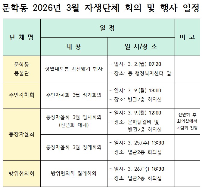 문학동 2026년 3월 자생단체 회의 및 행사 일정