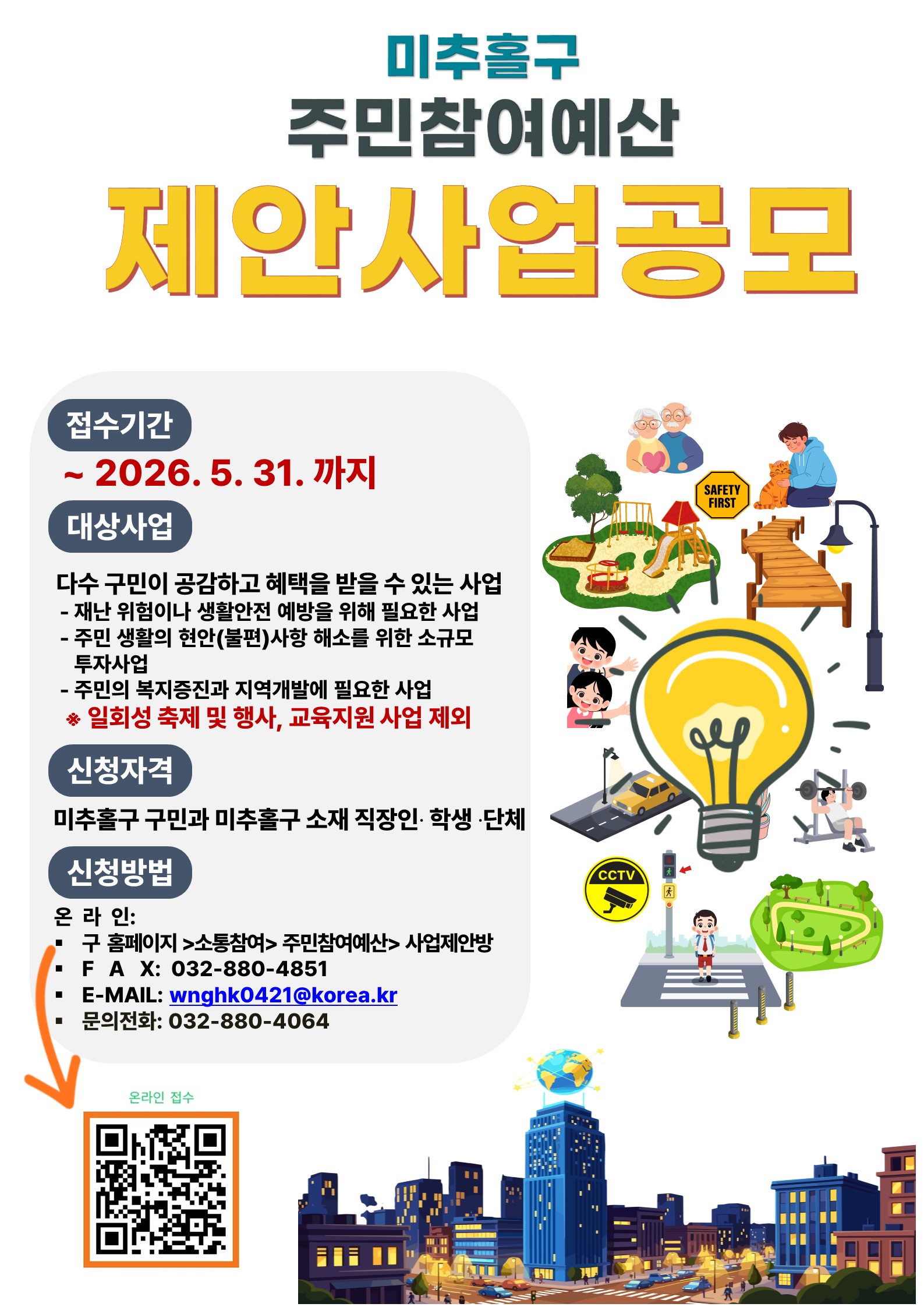 2027년 미추홀구 예산 편성을 위한 주민참여예산 제안사업 공모를 아래와 같이 안내하오니, 주민 여러분의 많은 관심과 참여 부탁드립니다.
