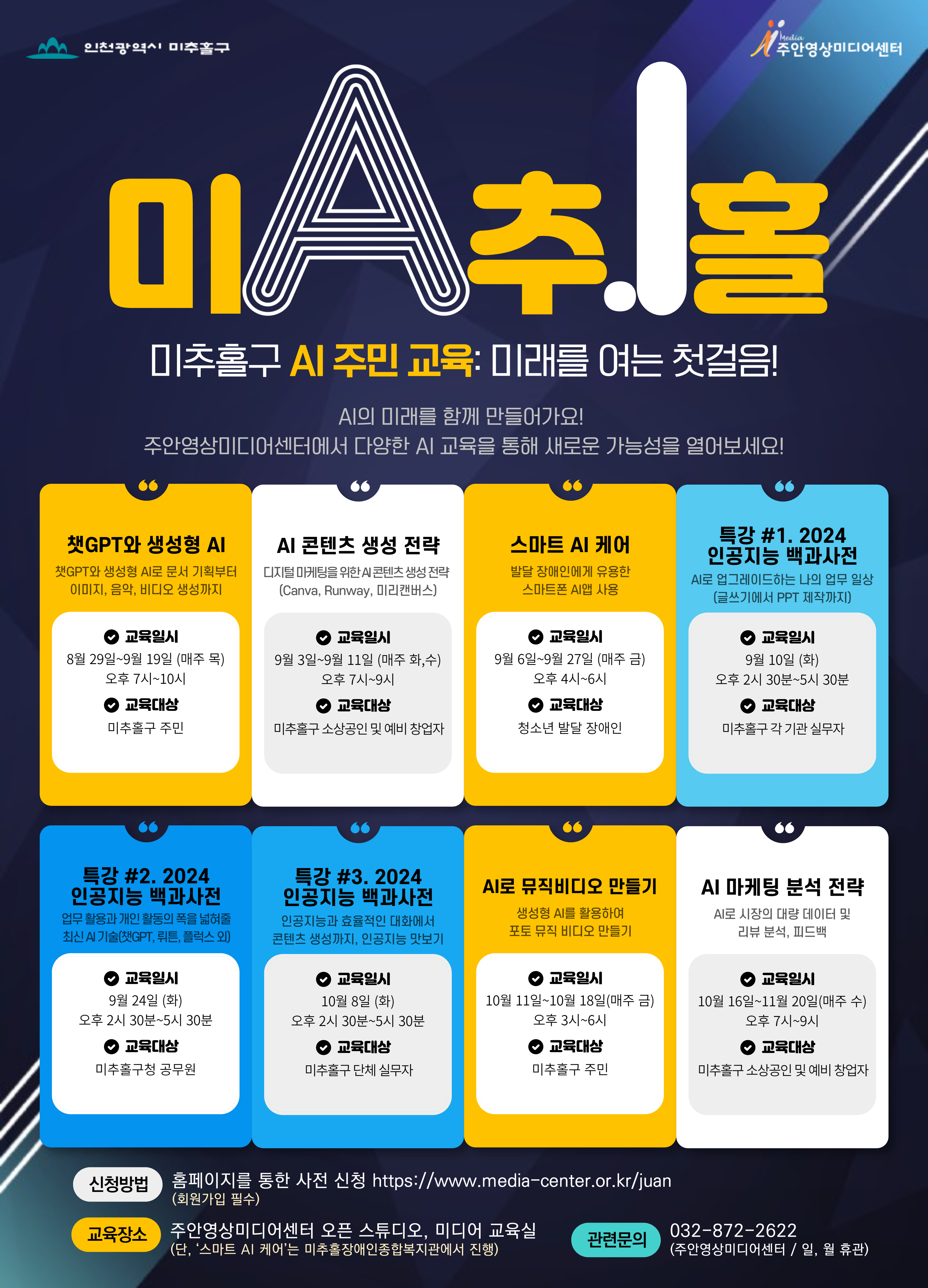 다. 기 간: 2024. 8. 29. ~ 11. 20.(교육별 상이) 라. 문 의 처: 032-872-2622, 주안영상미디어센터(홈페이지 참조)