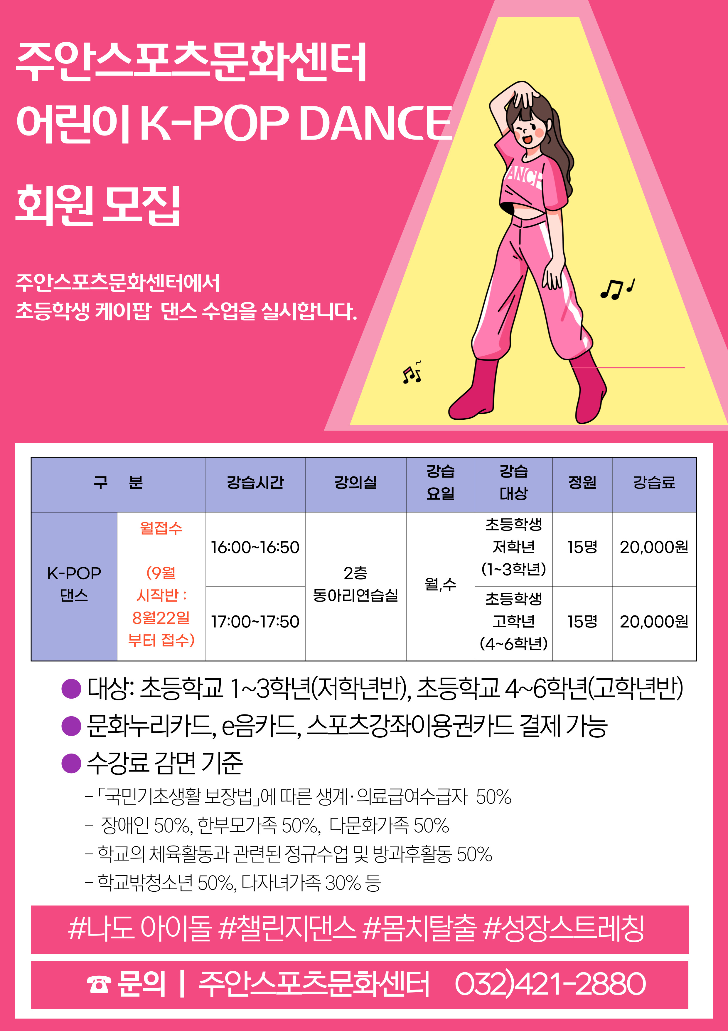 우리 구에서 (위탁)운영하고 있는 주안스포츠문화센터에서 어린이 케이팝 댄스 프로그램을 운영할 예정이오니 관심 있는 주민 여러분들의 많은 성원 부탁드립니다.