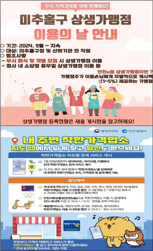 우리 구는 지역경제 활성화를 위해서 인천이음 상생가맹점 및 착한가격업소 이용 촉진을 도모하고 있사오니 주민 여러분께서는 목록에 있는 업소 이용을 적극적으로 고려하여 주시기 바랍니다.