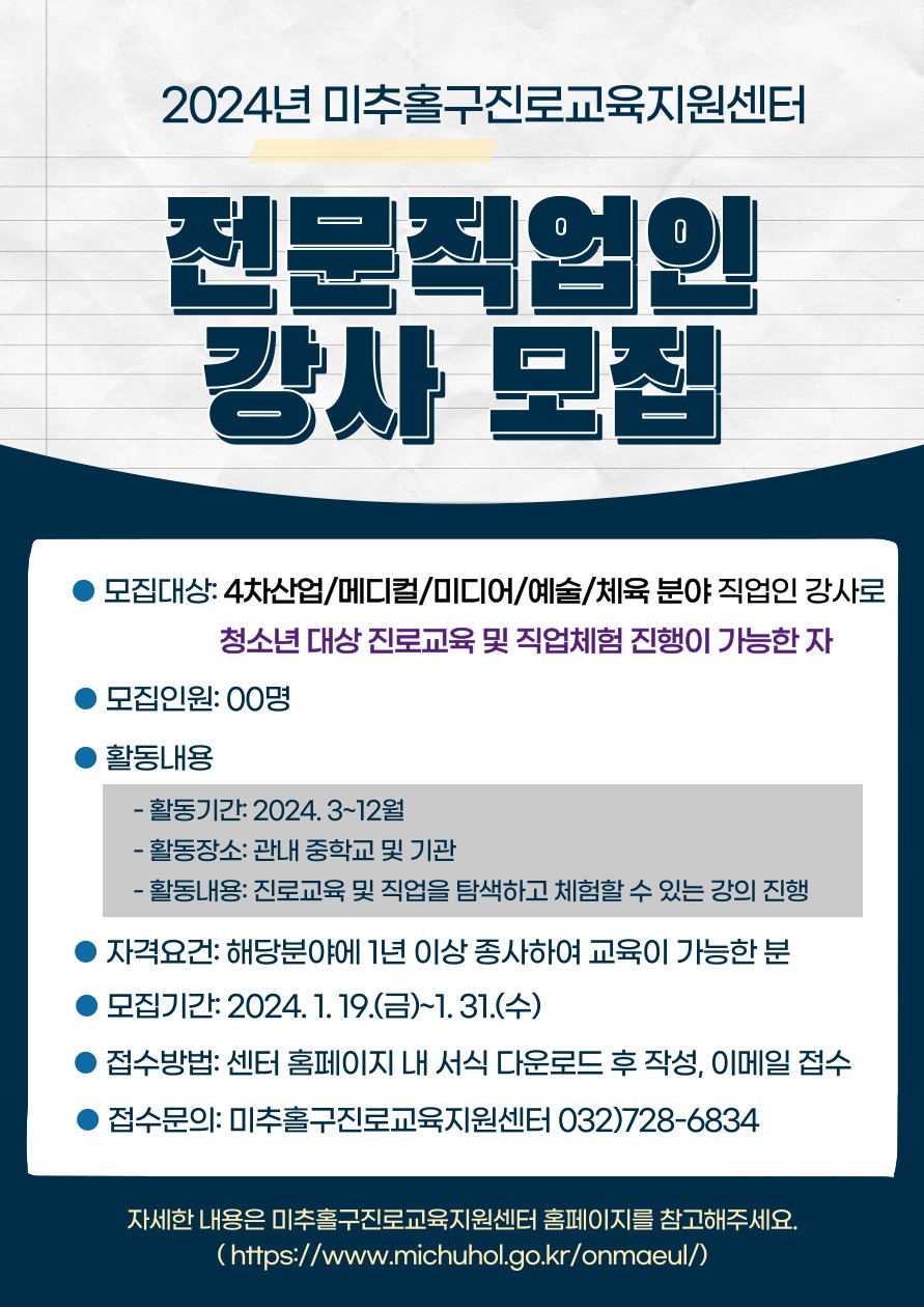 2024년 미추홀구진로교육지원센터에서 전문직업인 강사(진로강사)님을 모십니다.