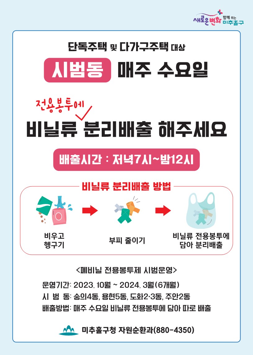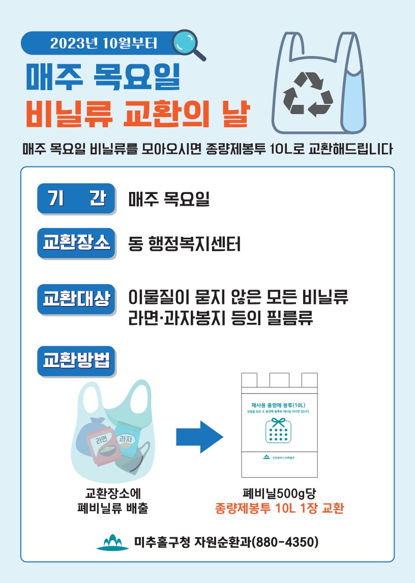 미추홀구 전 지역 대상으로 매주 목요일마다 폐비닐 교환의 날을 운영하고 있으니, 참고해주시기 바랍니다.