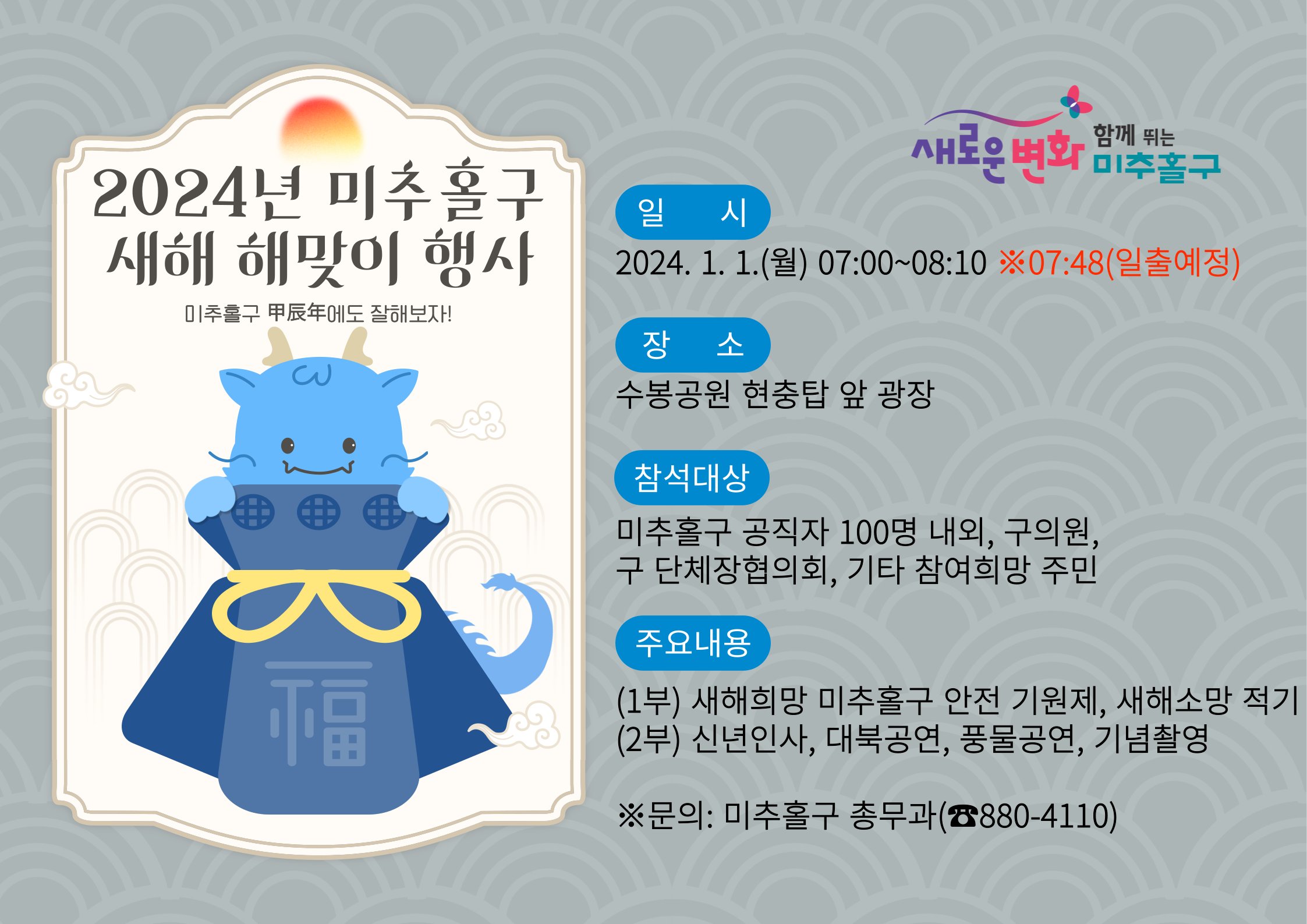 한마음 한뜻으로 다짐하는 새해 해맞이 행사를 개최하고자 하오니, 구민 여러분의 많은 관심과 성원 부탁드립니다.