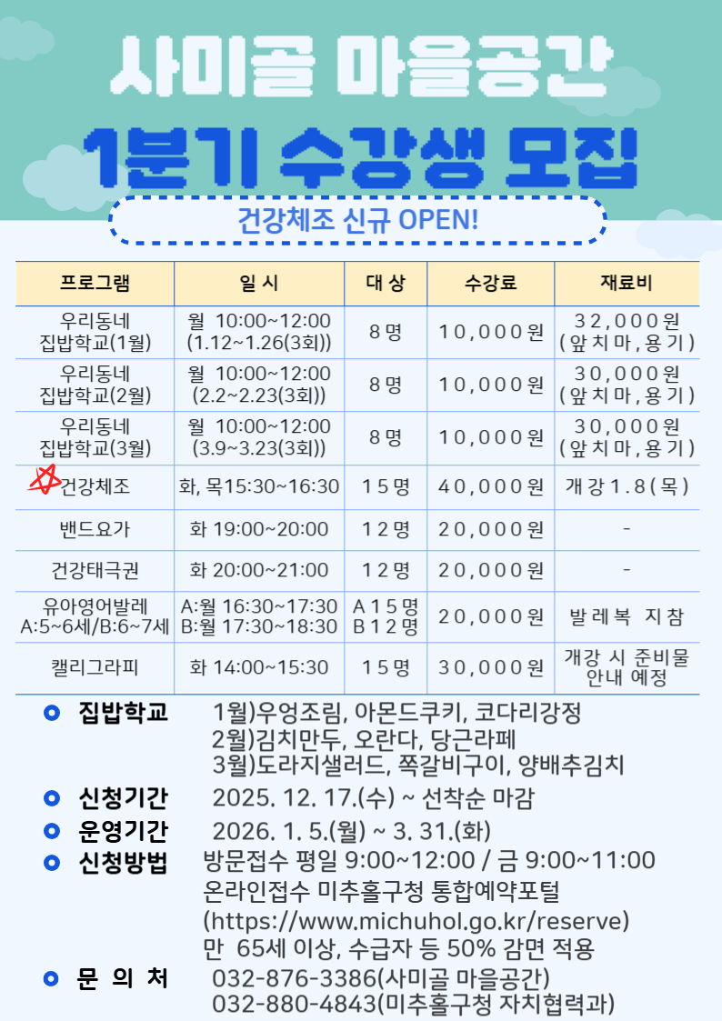 4. 신청방법: 2025. 12. 17.(수)부터 사미골 마을공간 방문 접수 (수봉남로6번길 143) 및 미추홀구청 통합예약포털 접수