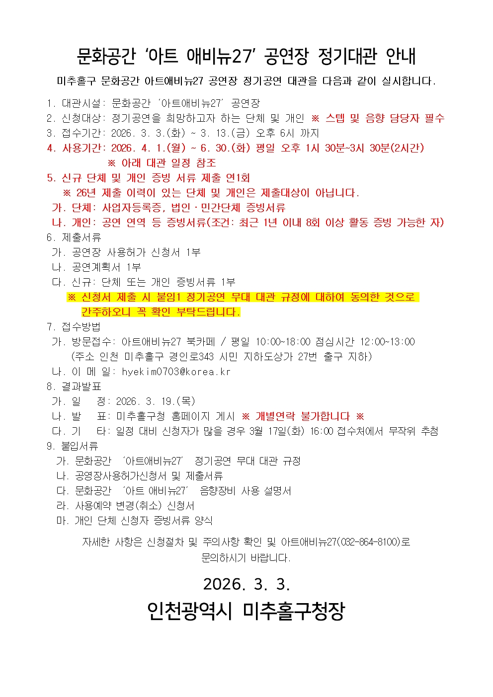 아트애비뉴27 2026년 2분기(4~6월) 공연장 정기대관을 붙임과 같이 안내드립니다.