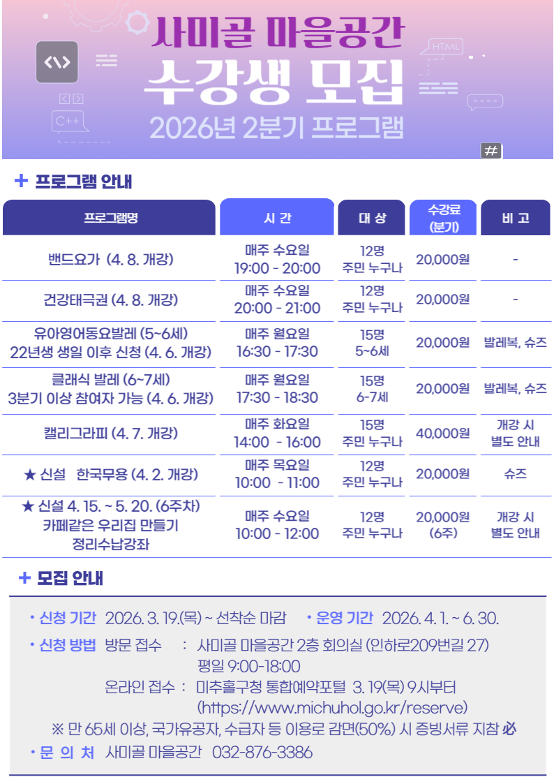 4. 신청방법: 2026. 3. 19.(목)부터 사미골 마을공간 방문 접수 (인하로209번길 27) 및 미추홀구청 통합예약포털 접수