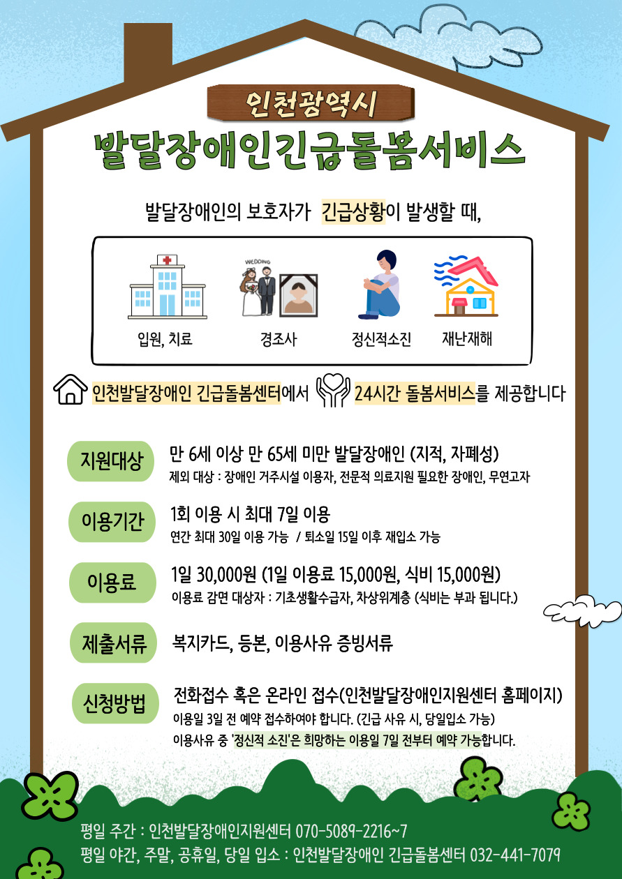 (평일야간, 주말, 공휴일, 당일입소) 인천발달장애인 긴급돌봄센터 032-441-7079