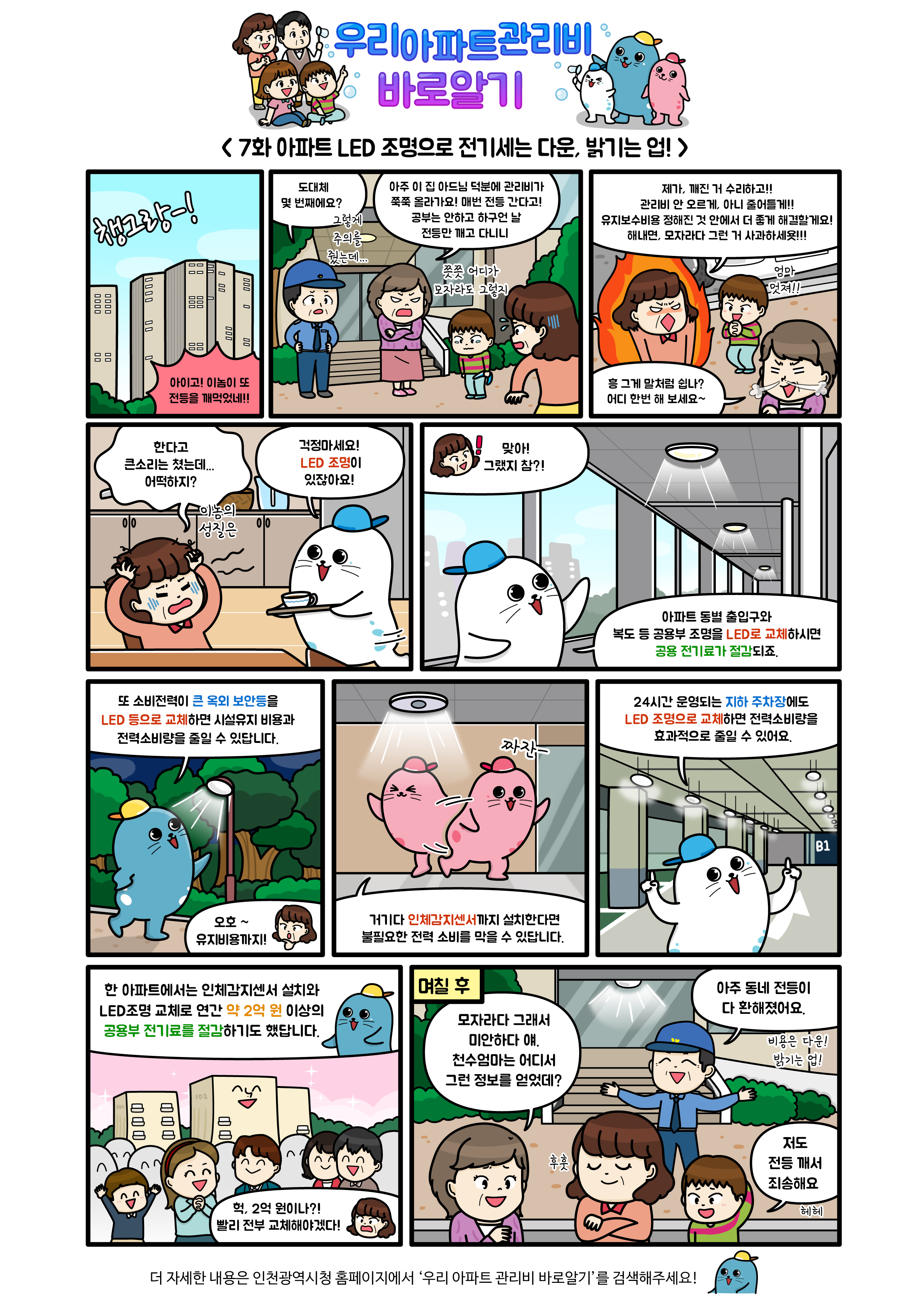 웹툰 7화(아파트 LED조명으로 전기세는 다운, 밝기는 업!)를 연재하고 홈페이지에 게시합니다.