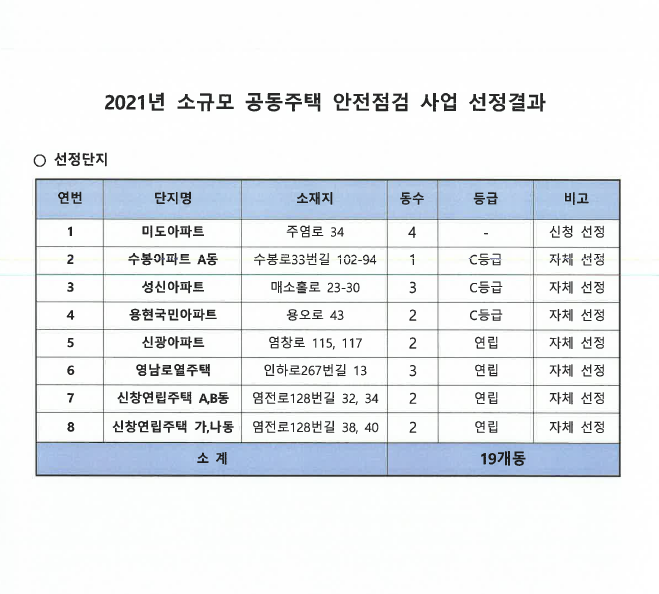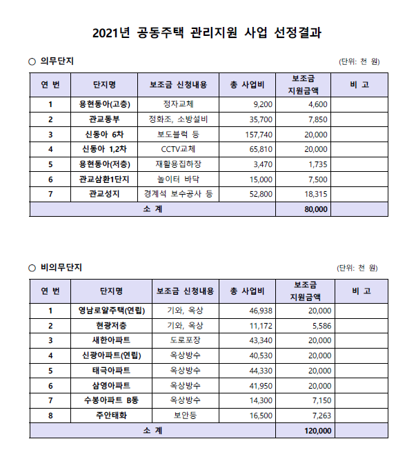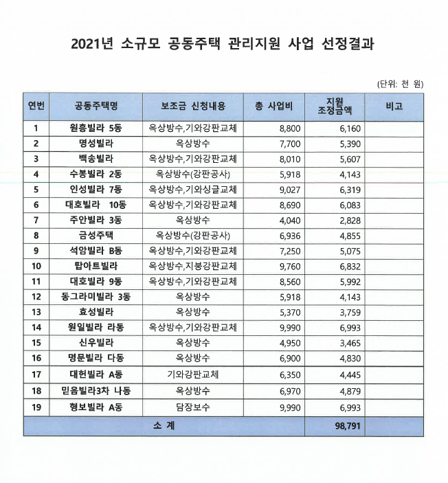 2021년 공동주택보조금 심의위원회 개최결과 붙임과 같이 선정되었음을 알리며,