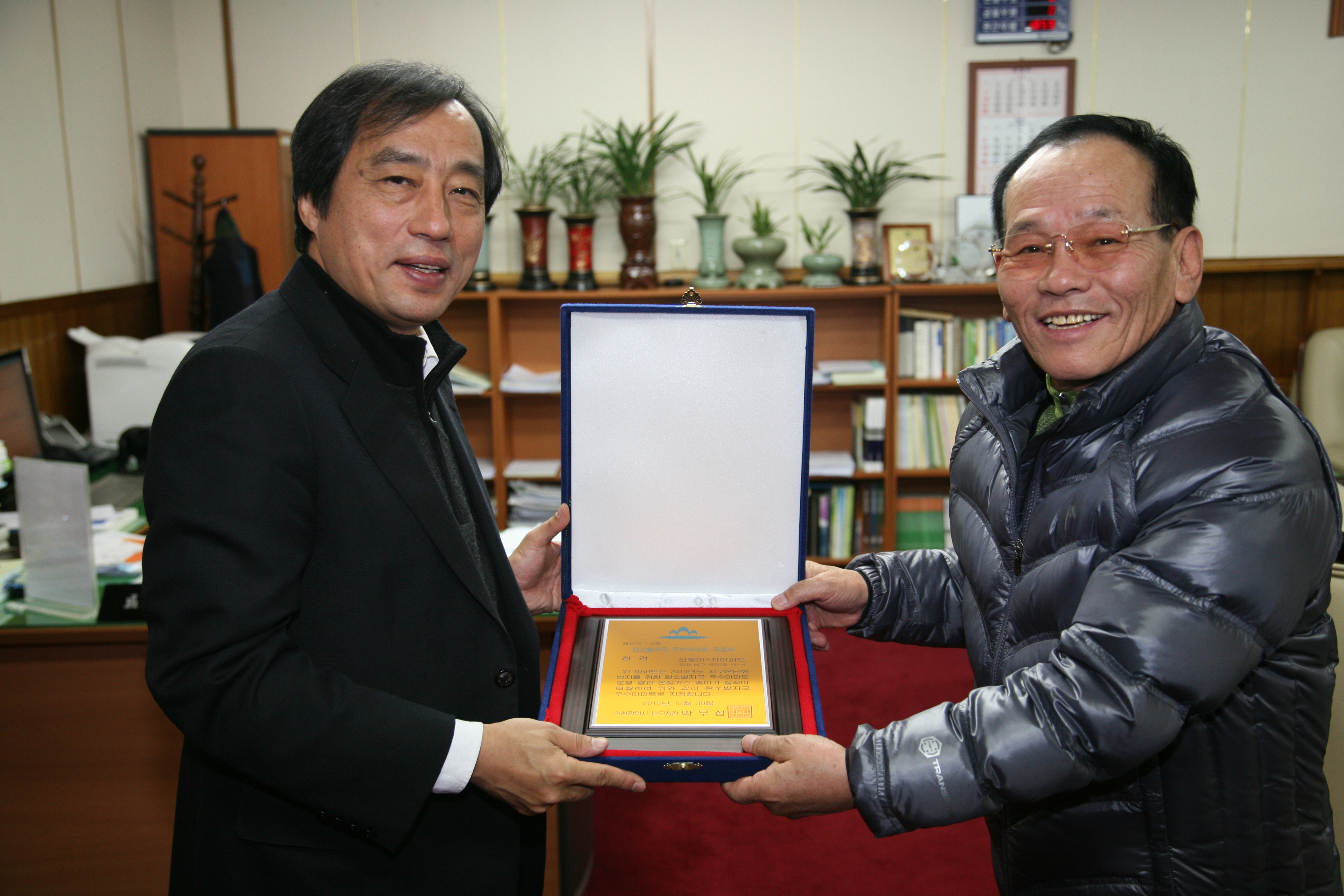 ‘탄소발자국 줄이기’는 아파트 개별세대와 아파트단지가 함께 이색적인 기후변화에 공동으로 대응하는 공동체의식과 시민의식을 높이기 위해 2010년 4월부터 시행해 왔다. 지난 해 탄소발자국 줄이기 우리 가정 ‘탄소포인트제(저탄소 녹색통장) 갖기’ 운동실천에 동참한 관내 15개 아파트 개별세대와 아파트 단지 중 온실가스 감축 이행에 좋은 결과를 낸 용현동 금호2차아파트와 한양2차아파트, 관교동 성지아파트, 용현동 신창미션힐아파트, 학익동 신동아3차아파트를 대상으로 「탄소발자국 우수아파트」지정서를 수여했다.