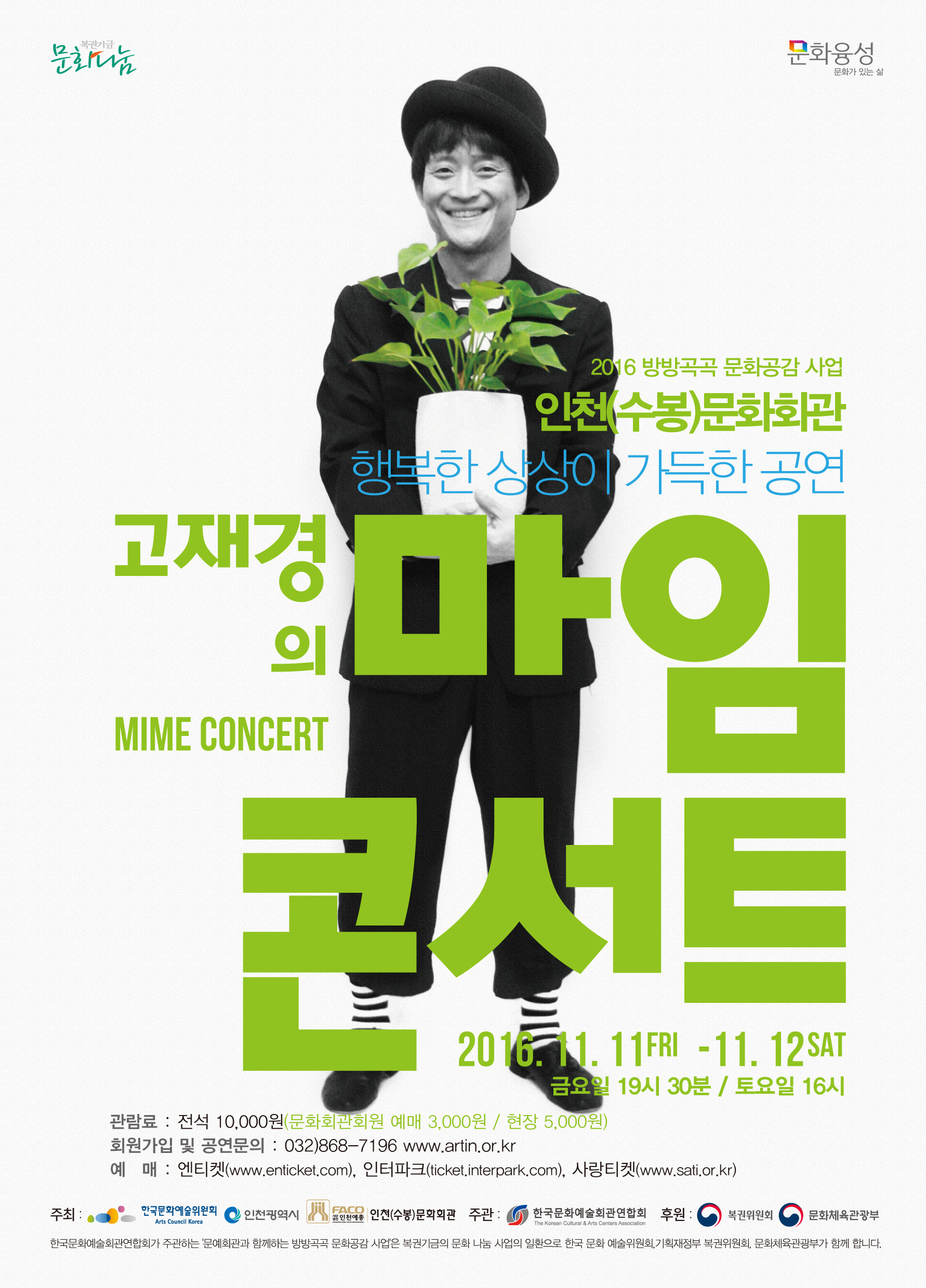 인천예총이 오는 11월 11, 12일 이틀 동안 인천수봉문화회관 소극장에 고재경의 마임콘서트를 올린다. 문예회관과 함께하는 2016 방방곡곡 문화공감사업 일환으로 초청했다.